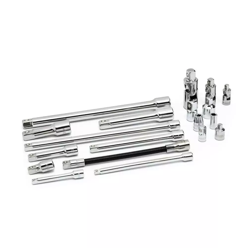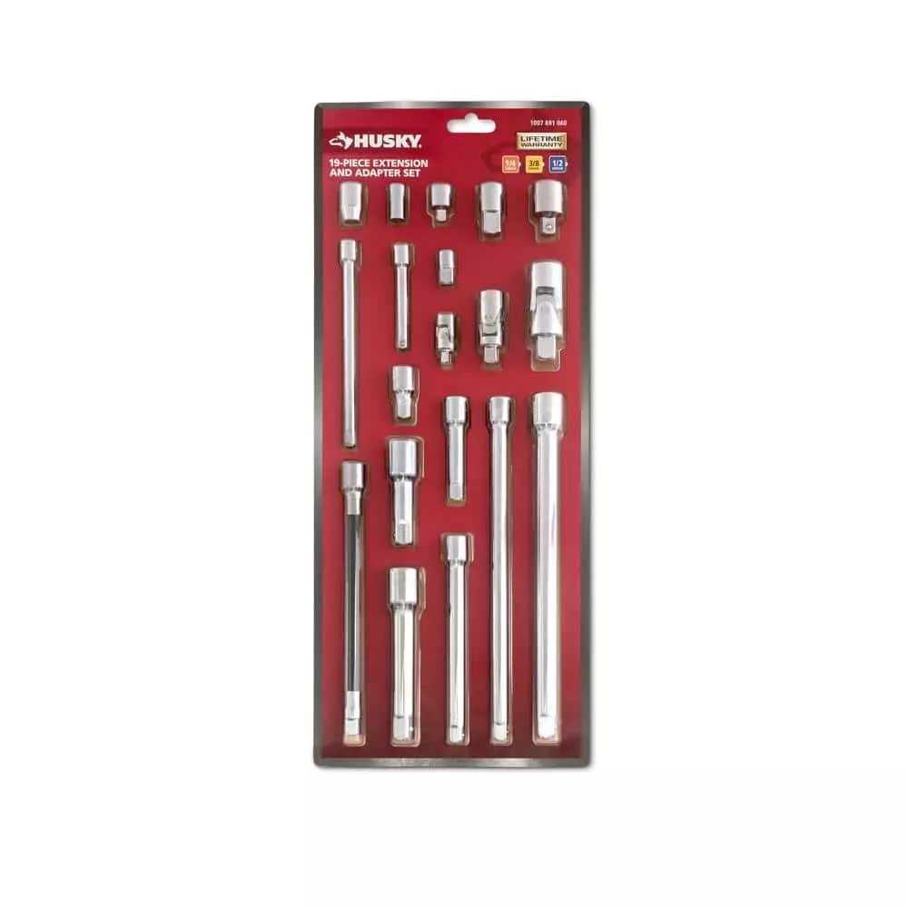 The Husky 19-piece complete Accessory Set includes a variety of extensions, adapters and universal joints that are made from alloy steel for strength and long-lasting performance. The finish provides resistance to corrosion. The chamfered lead-in on both ends allows for quick and easy attachment to the drive tools and sockets. Set includes: 9 standard extensions- 1/4 in. drive (3, 6 in.) 3/8 in. drive ( 1-1/2, 3, 6, 10 in.) 1/2 in. drive ( 3 in., 5 in., 10 in.), one 3/8 in. drive 8 in. flex extension, 4 drive adapters (1/4F to 3/8M, 3/8F to 1/4M, 3/8F to 1/2M and 1/2F to 3/8M), 3 universal joints (1/4, 3/8, 1/2 in.) and 2 bit adapter sockets (1/4 in. and 3/8 in. drive).
