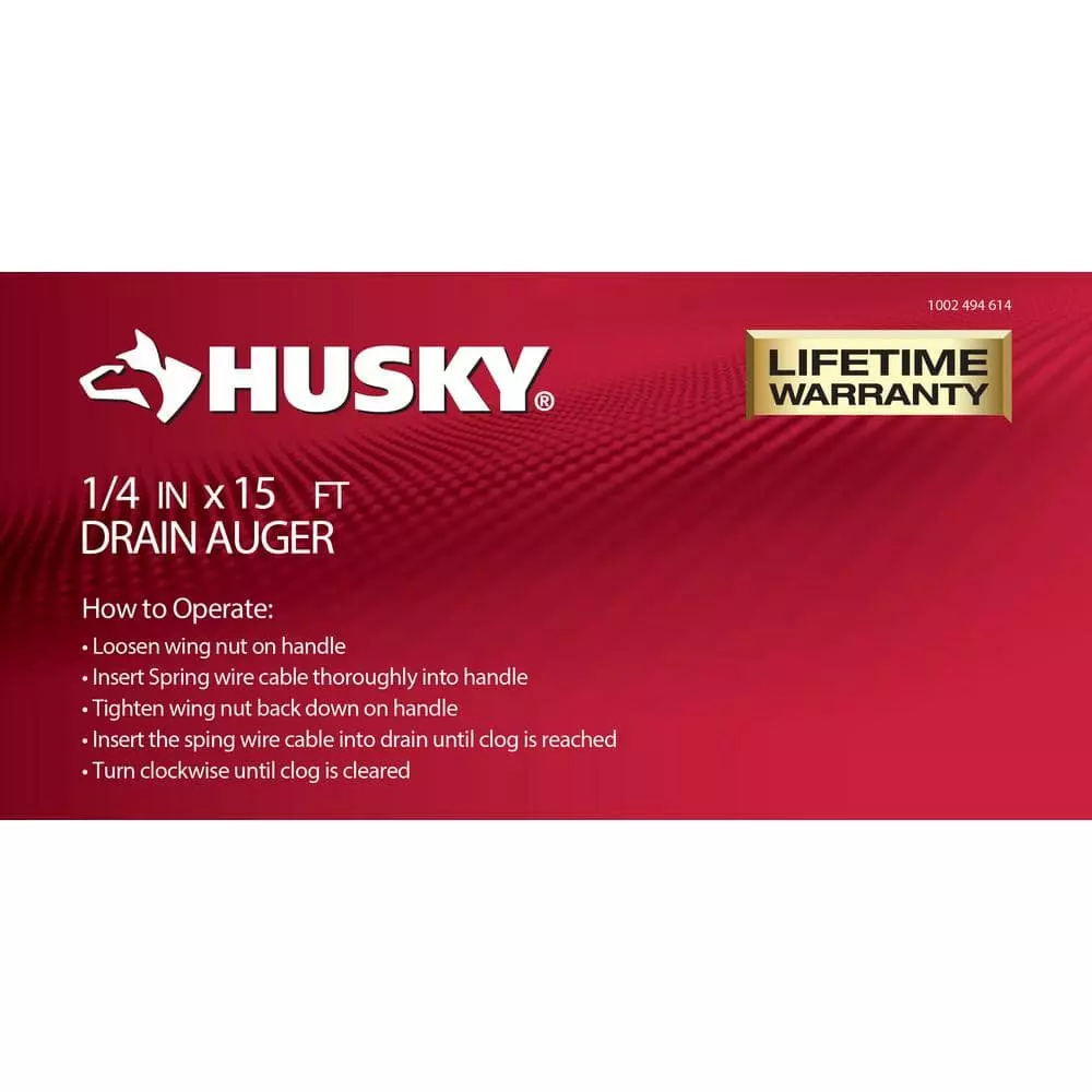 Designed for most small household drains, the Husky 1/4 in. x 15 ft. drain auger features a high-quality spring wire for excellent flexibility in tight bends. It also includes a high-impact caddy for easy storage. The design provides maximum thrusting action, even though strainer crossbars.