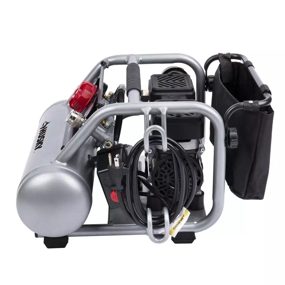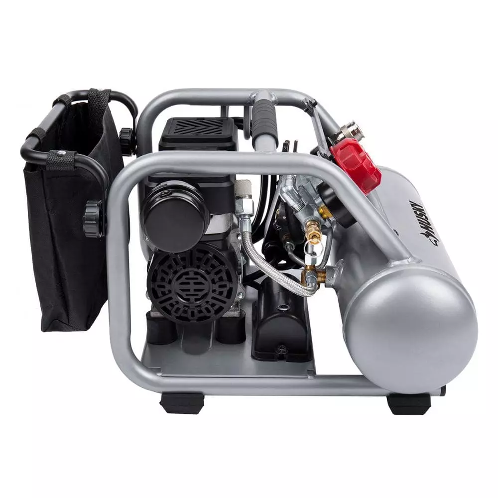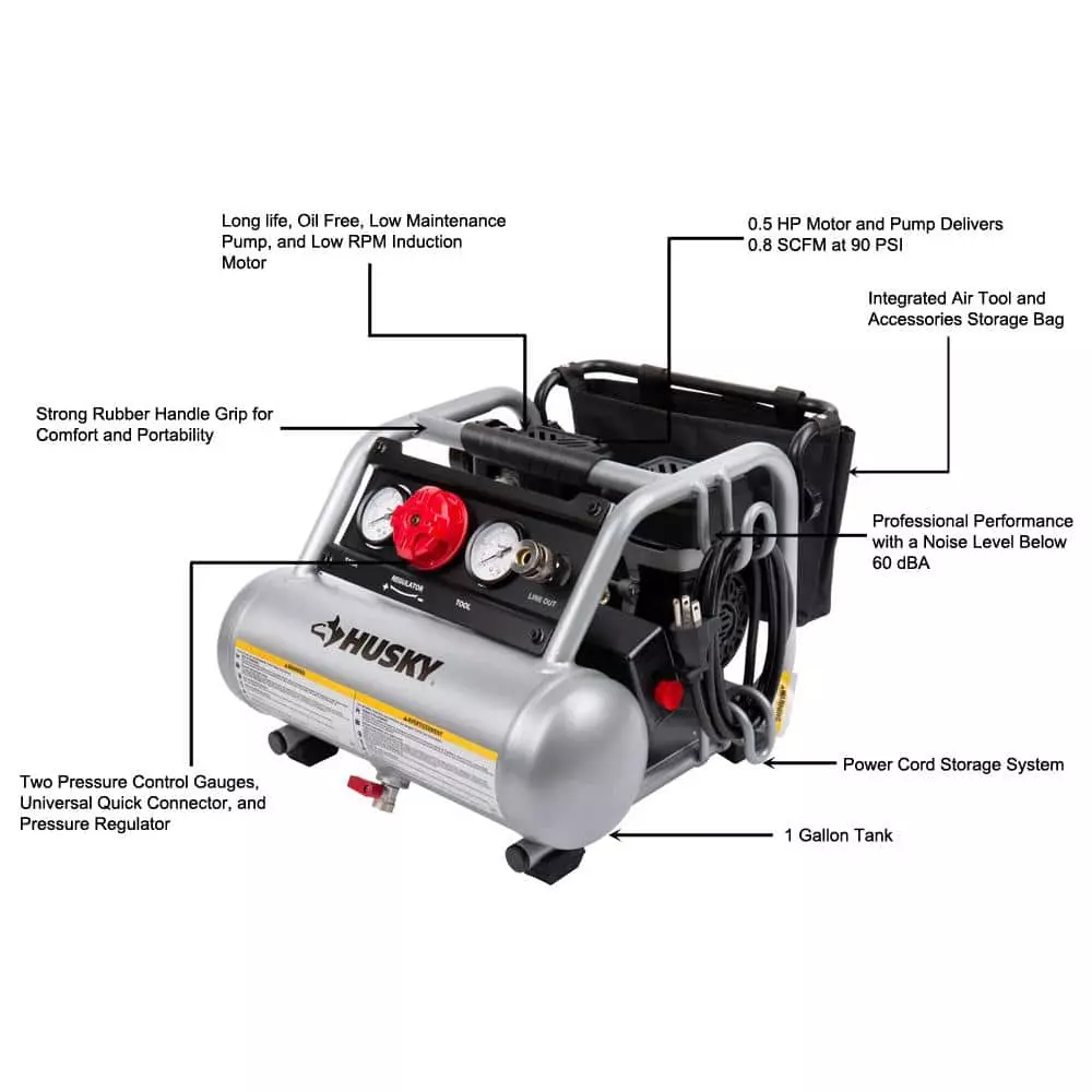 The Husky 1 Gal. Silent Air Compressor is the ideal tool to power home improvement and DIY projects. Its lightweight design (only 30 lbs.) and powerful 1/2 HP motor delivers 0.8 SCFM @ 90 psi with a noise level of only 60 dB. The integrated metal control panel comes with a large regulator knob, 2 metal case gauges and a quick coupler to make connections a snap. The reinforced frame protects the motor from damage and includes convenient cord storage. This compact compressor also features a rubber reinforced handle for easy portability and a built in storage bag to hold tools and accessories. You will find this sturdy compressor is perfect for jobs like inflation, cleaning and operating a stapler or a finishing nailer with ease.