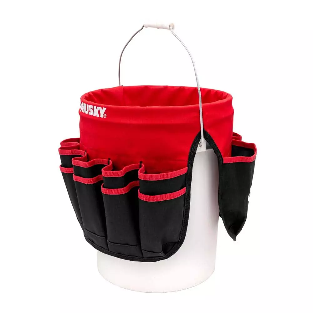 Get convenient and easy storage with the Husky Bucket Jockey. Constructed of 600 Denier water-resistant material, its innovative design features deeper pockets to allow a more versatile array of tools and accessories to be stored with ease. Pair with The Home Depot Homer 5 Gallon Bucket – as the Husky 12 in. tool bucket storage is designed to fit on the outside of your bucket. The Husky Bucket Jockey is equipped with 30 pockets in total for optimal storage.