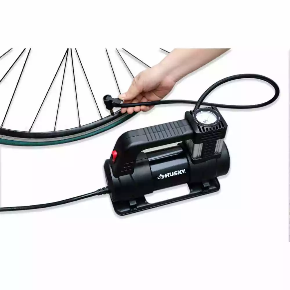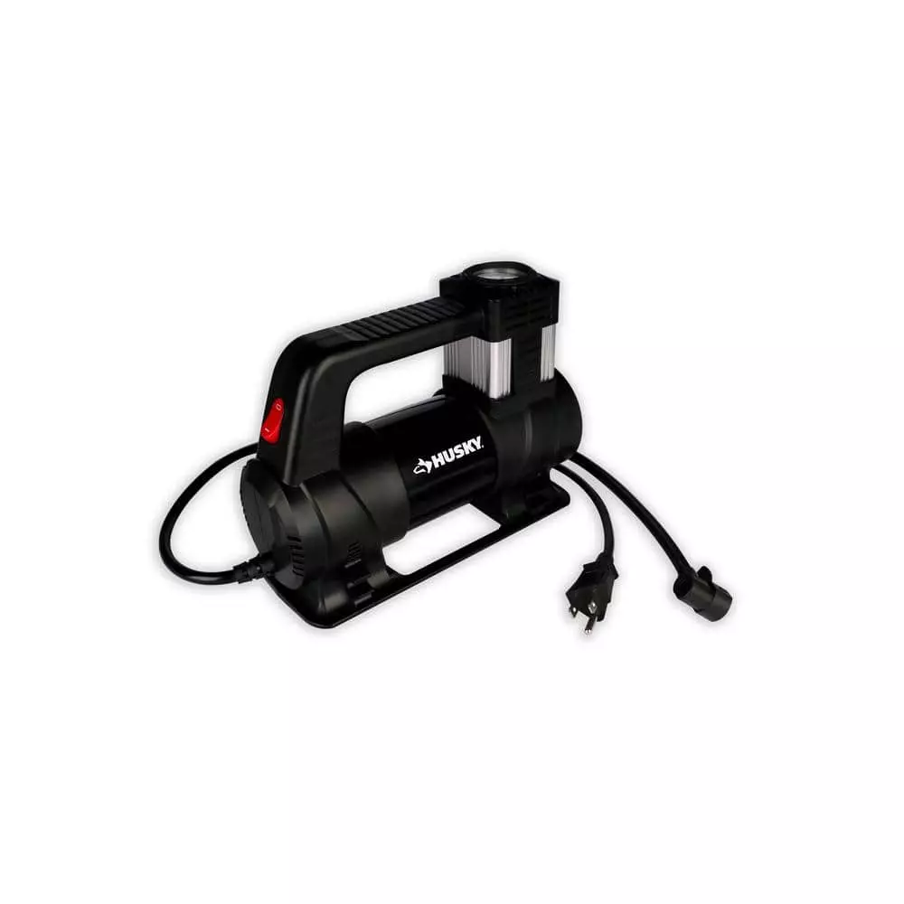 The Husky 120-Volt Inflator inflates vehicle tires, bicycle tires, air mattresses and sports equipment, its direct-drive motor is powerful, quiet and fast, the inflator features an analog pressure gauge with backlight for easy viewing with a maximum pressure detection of 120 PSI, it plugs into a standard household electrical outlet and is equipped with a large power button for no-fuss operation.