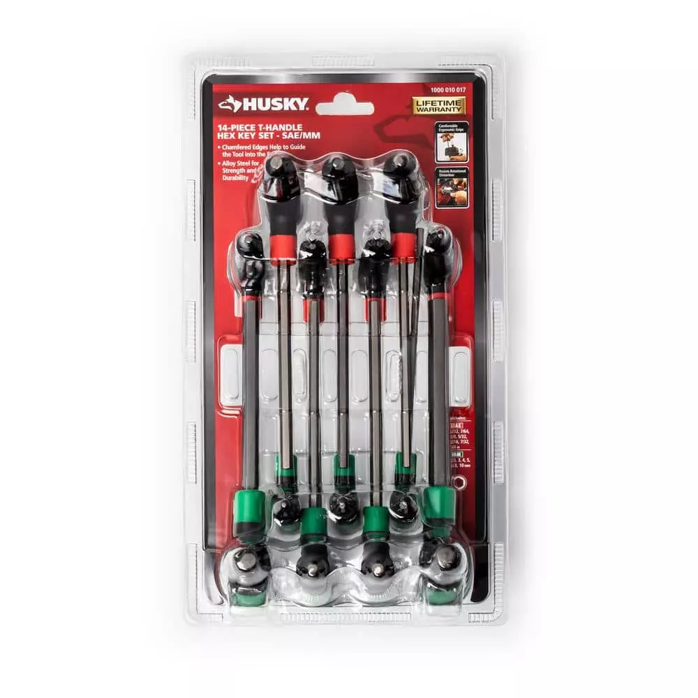 The Husky 14-Piece SAE and MM T-through Handle Hex Key Set is manufactured from allow steel for strength and durability. The comfortable ergonomic grip covers an L-shaped key giving you extra leverage on stubborn fasteners. The keys are designed to resist rotational distortion for years of service.