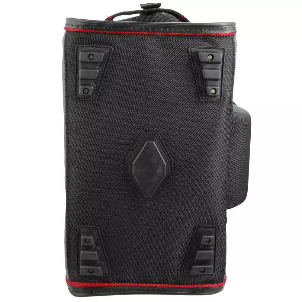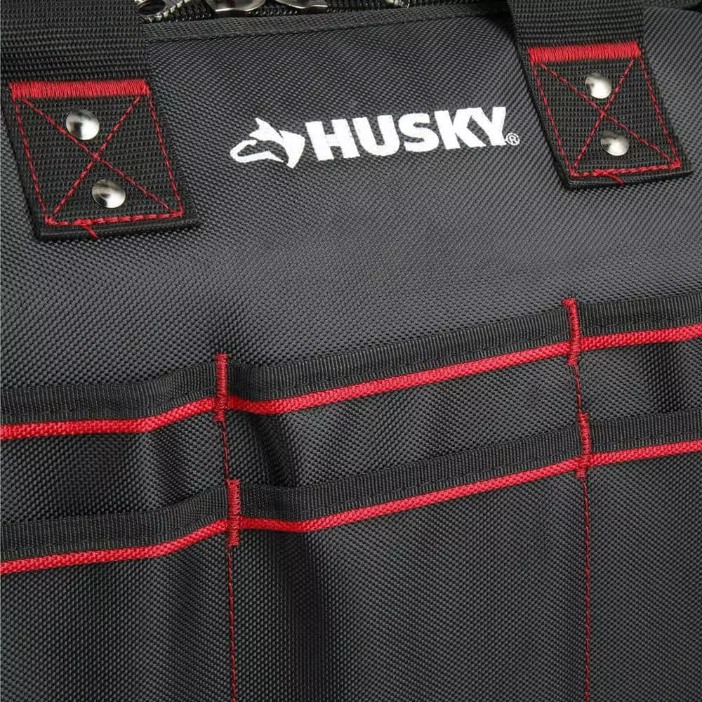 Keep your tools organized and handy with this Husky 16 in. Large Mouth Bag. It features a main compartment with dual lockable security zippers and a hard-sided pocket on the exterior. It also has 11 additional exterior storage pockets, a glove/rag clip for air-dry storage, an easy-access tape clip and a lockable security zipper. This bag will last you over time with a heavy-duty 1680D fabric construction with full reinforced edges. There are five feet on the base and the inside has 25 pockets and elastic straps to hold tools of all sizes.