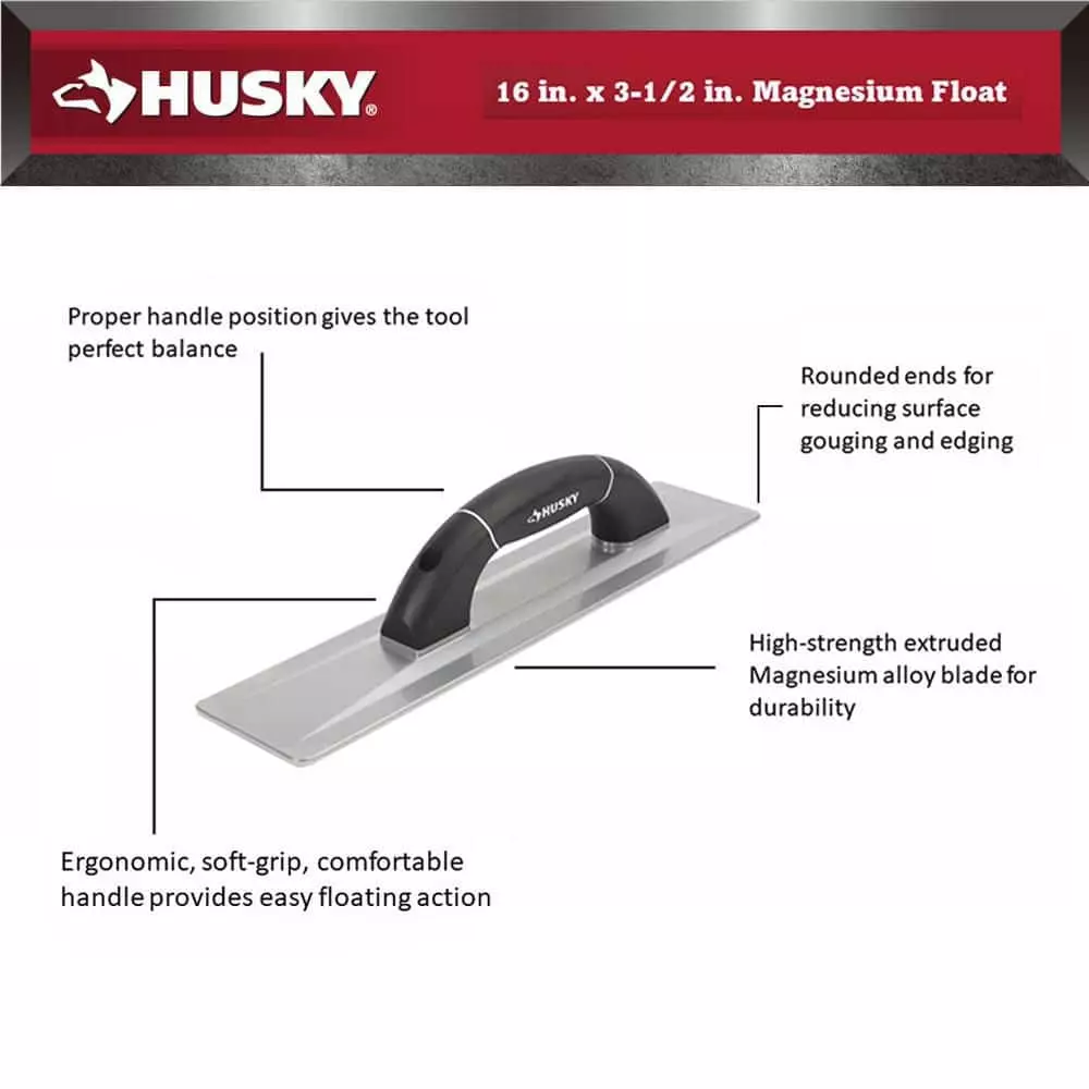 The 16 in. x 3-1/2 in. Magnesium Float is built to satisfy even the most demanding users. The rounded corners reduce gouging, making the job quicker and easier. Comfortable, ergonomic soft grip handle.