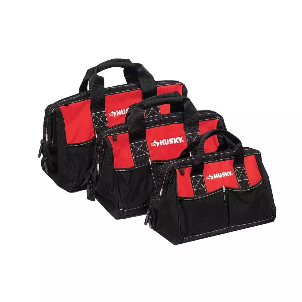 The Husky 18 in., 15 in. and 12 in. Tool Bag Combo features 3 zippered top tool bags constructed of 600 D, water-resistant material. These tool bags are great for storing your hand tools, small parts, accessories, and more at home or on the job site. All 3 Husky tool bags combined have 14 external pockets for all your storage and organization needs. Only available at The Home Depot.