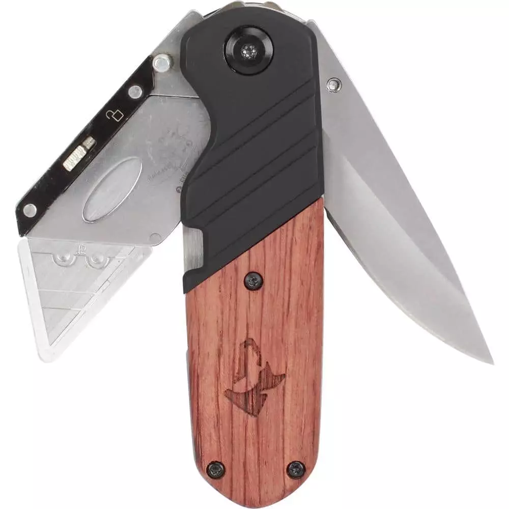 The Husky Dual Blade Folding Knife with Wooden Handle features 2 knives in 1 compact design a folding utility knife and a folding serrated sporting knife. The folding side lock utility knife features a quick-change blade mechanism that accepts standard size utility blades. The side lock design locks either blade in place for safe and efficient cutting while the convenient folding design and wooden handle make it easy for a user to safely store the knife in their pocket. This knife is great for use at home, on the job or outdoors.