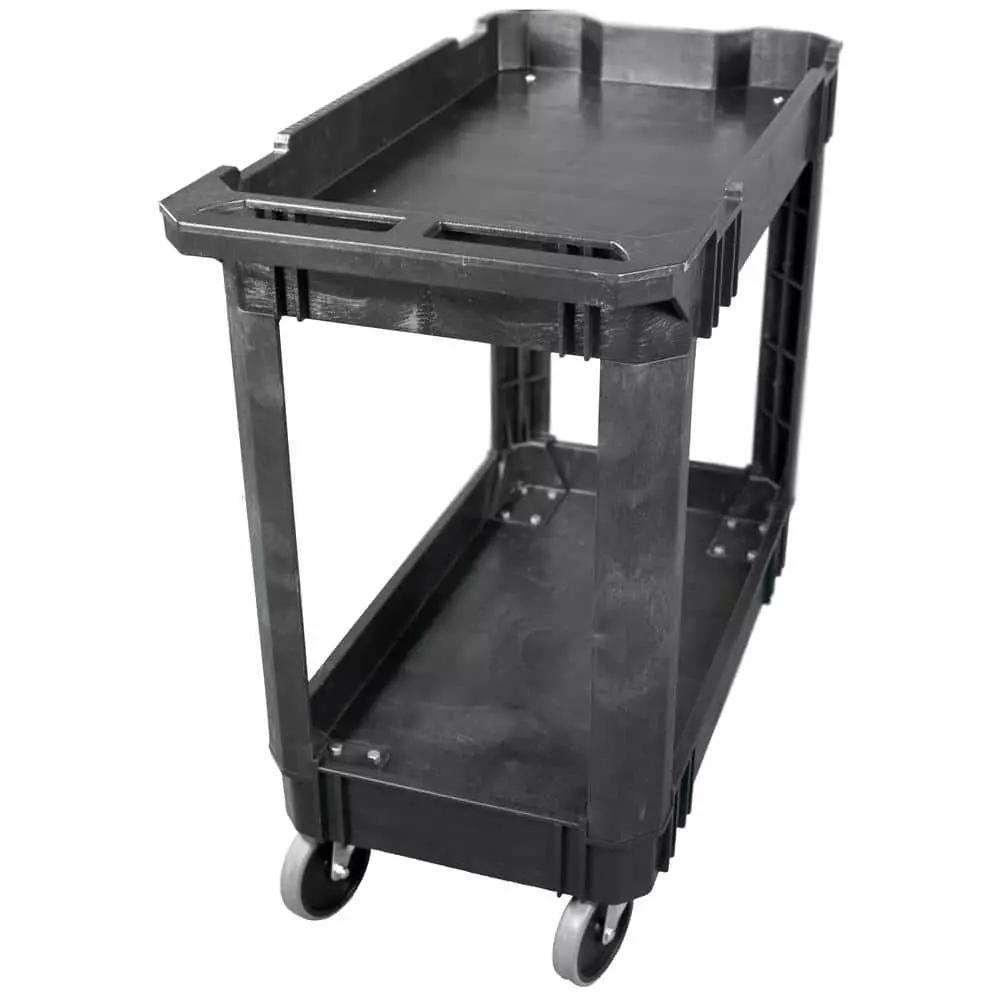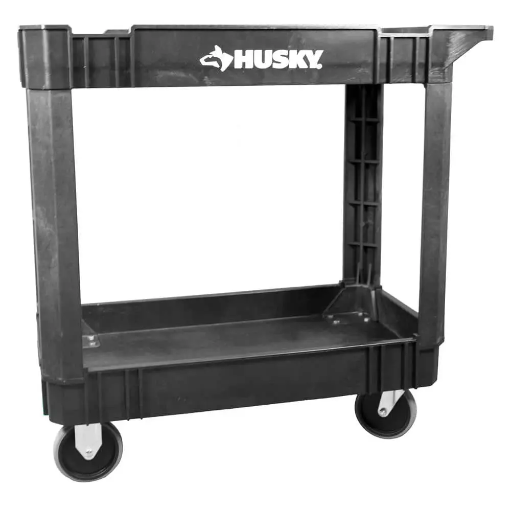 The Husky 2-Shelf Utility Cart has large 4 in. swivel casters for ease of mobility. The cart can hold up to 500 lbs., 250 lbs. on each shelf. Its structural foam construction means the cart won’t dent, chip or peel.