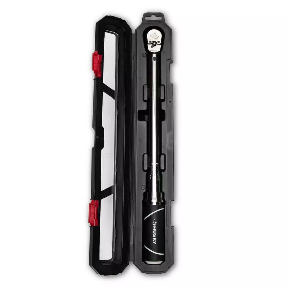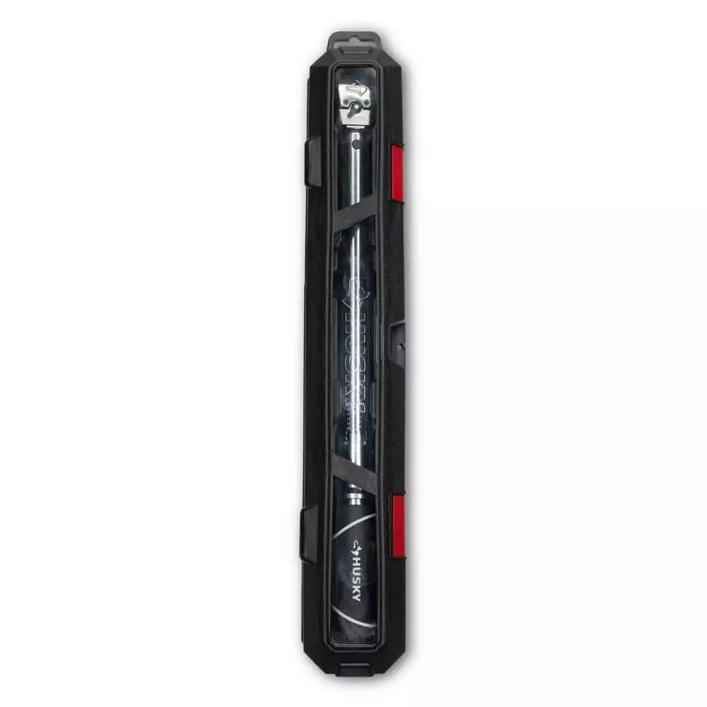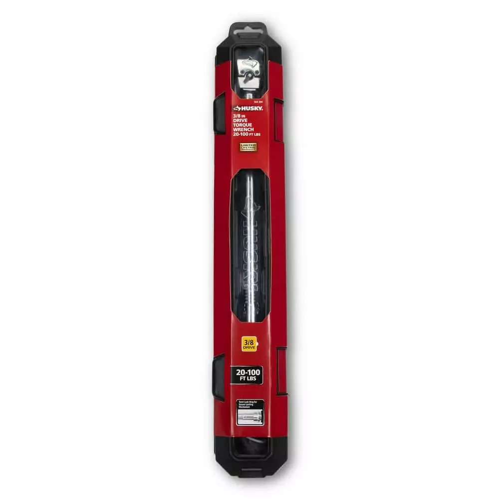 The Husky 3/8 in. Click Torque Wrench has a range of 20 ft./lbs. to 100 ft./lbs. and is made of alloy steel construction for strength and long-lasting performance. It also comes in a hard plastic storage case for safe-keeping when not in use. Its ergonomically designed handle easily turns to set torque. The finish provides resistance to corrosion and wipes clean easily. The Torque wrench features a torque accuracy of plus/minus 3% CW in the upper 80% of wrench capability, and will give you an audible click when the desired torque setting is reached. Easy to use and effective in getting the job done accurately.