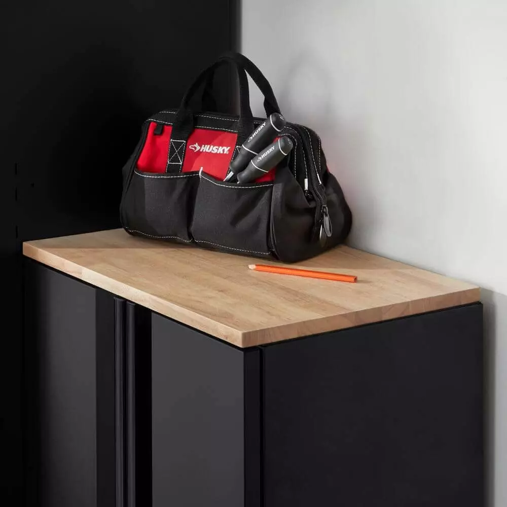 Easily store your items with this 24 in. Solid Wood Work Surface for Regular Duty Welded Steel Garage Base Cabinets. It features solid wood material for durability. Use this for tools, sporting equipment and other items.