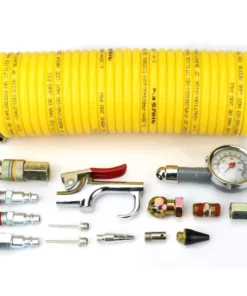 The 15-Piece Accessory Kit includes a 25 ft. nylon recoil hose, a blow gun and accessories to help clean work areas, inflate objects or connect tools. Couplers and plugs for connection purposes are also included. Features durable steel construction with zinc plating for corrosion resistance. This is a great starter kit for anyone with a compressor to give you all the tools needed in connecting and use for your airline needs. 1-piece – 25 ft. Nylon recoil hose. 1-piece blow gun, 1-piece ball foot chuck, 1-piece tire gauge, 2-piece male I/M plugs, 1-piece female I/M plug, 1-piece male coupling, 1-piece female coupling, 1-piece safety nozzle, 1-piece tapered inflator tip, 2-piece inflation needles, 1-piece rubber blowgun tip, 1-piece universal coupler.