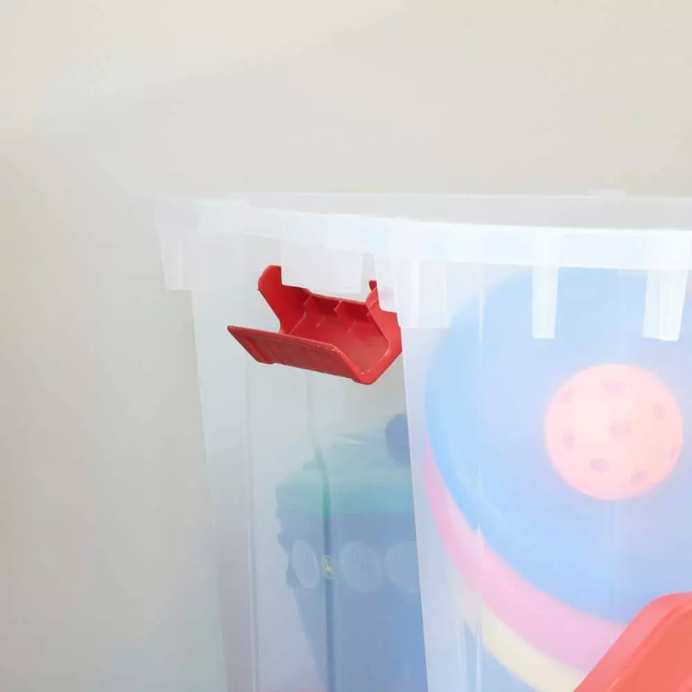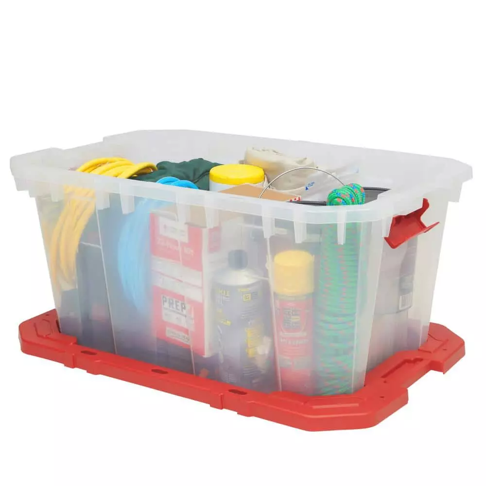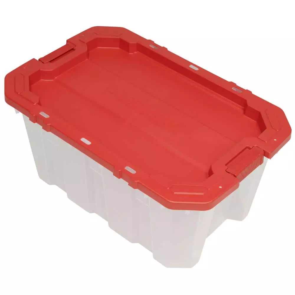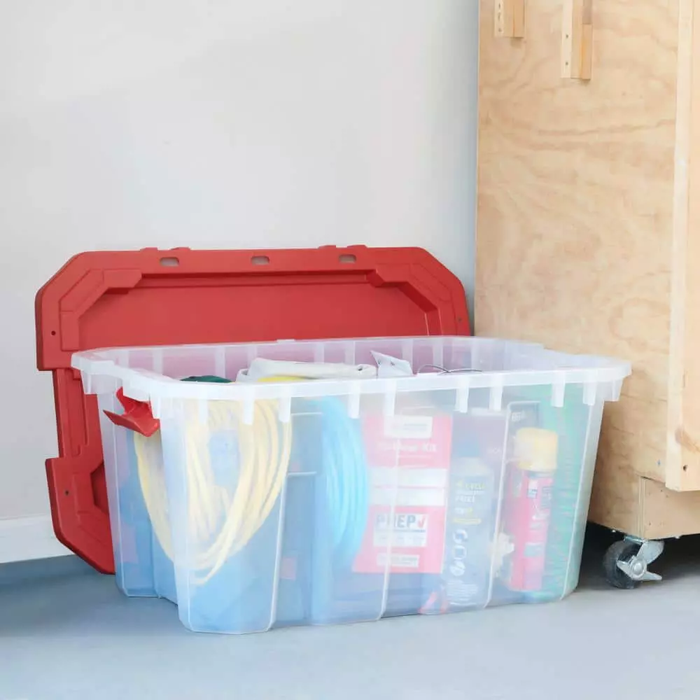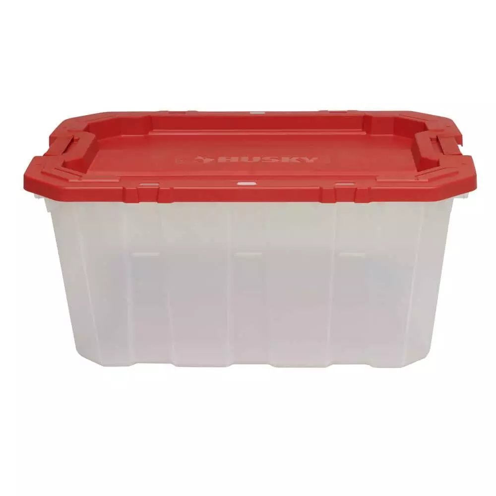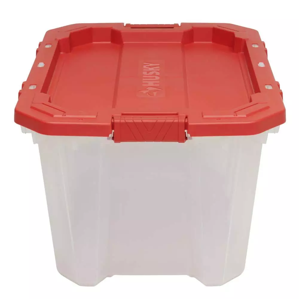 This Husky 25 Gal. Clear heavy duty stackable storage tote is designed to handle all your storage needs whether it’s on the jobsite or around the house. The tote base is constructed of a proprietary clarified polypropylene resin blend to achieve superior strength and durability with red reinforced lid and matching red latches to secure and protect your valuables. This tote is a perfect option for the meticulous organizer who demands the very best in heavy-duty storage and protection with the added bonus of easily identifying contents without opening the lid. Integrated slots make the tote lockable to keep away unwanted intruders. This tote features innovative tie-down channels that allow it to be easily strapped down for simple transportation and fits most hitch mounted cargo carriers.