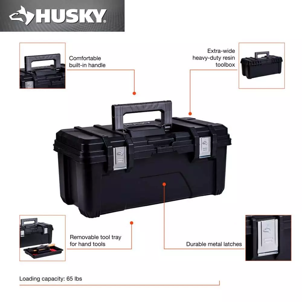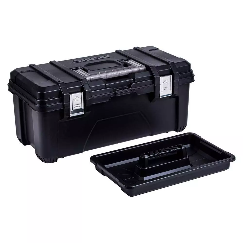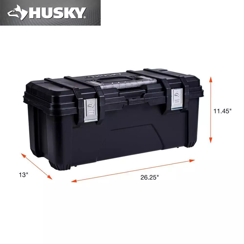 The Husky 26 in. Tool Box is the largest in its size category. This rugged built box, with its removable tool tray and large lid organizers allows both the professional and DIYer to organizer all of their tools for the simplest or toughest of jobs. The built-in padlock eye and dual heavy-duty metal latches will secure your tools where ever you go.