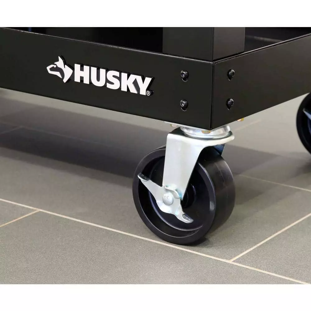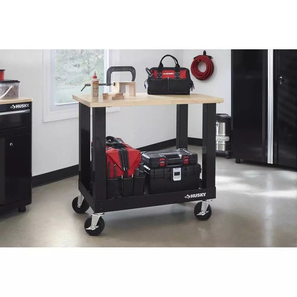 Get portable workspace and storage with this Husky 3-ft. workbench. The solid wood top holds up to 600 lbs., and the bottom tray supports up to 80 lbs. For easy moving, it includes four 360-degree swivel casters. You can assemble this workbench quickly with included tools.