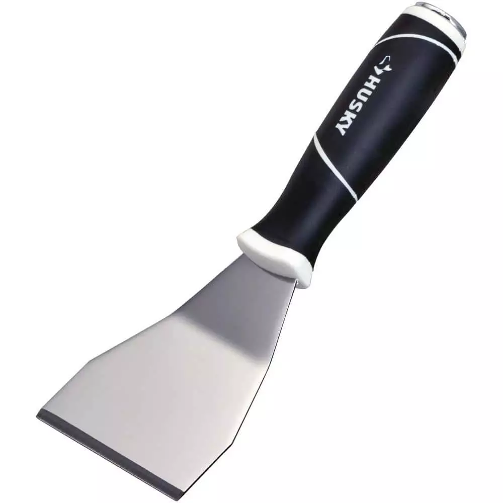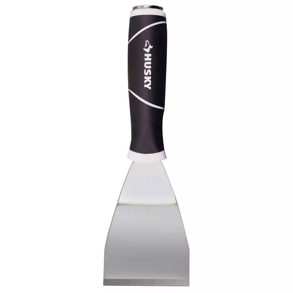 The Husky 3 in. bent scraper features a thick, stainless-steel blade for heavy duty jobs. This scraper has a screw out hammer end and it is extendable with a standard extension pole. Soft grip handle provides comfort in use.