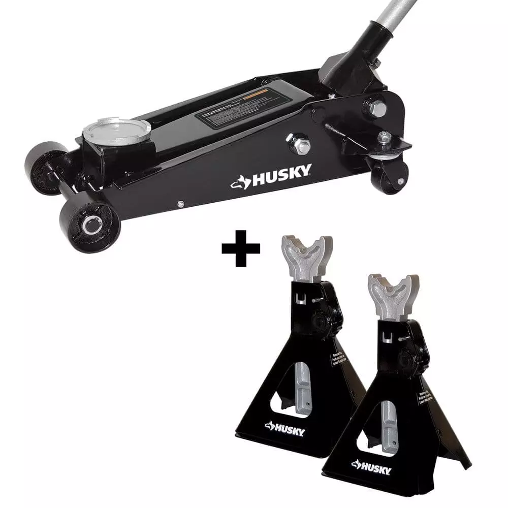 The Husky 3-Ton Garage Floor Jack can easily lift up to 6, 000 lbs. at a maximum height of 21 in. The swivel casters are designed to position accurately under your vehicle. The detachable included handle allows for easy and convenient storage when this car jack is not in use. The 3-Ton Garage Jack uses hydraulic pressure to lift a vehicle off the ground and features a steel construction. The Husky 3-Ton Garage Jack offers easy positioning under cars, trucks and SUVs. This car jack is the perfect car accessory to add to your Husky automotive and tool collection. The Husky 3-Ton Jack Stand pair is designed to lift up to 6,000 lbs. (3-tons) with a heavy-duty steel base with anti-sink feet for added durability and safety. This pair of jack stands have an extension range from 12 in. up to 17.5 in. and are equipped with a locking pin for added safety. This jack stand car accessory can be used with an SUV, light truck and standard automobiles. The Husky 3-Ton Jack Stand pair works with any Husky automotive floor jack, found at the Home Depot.