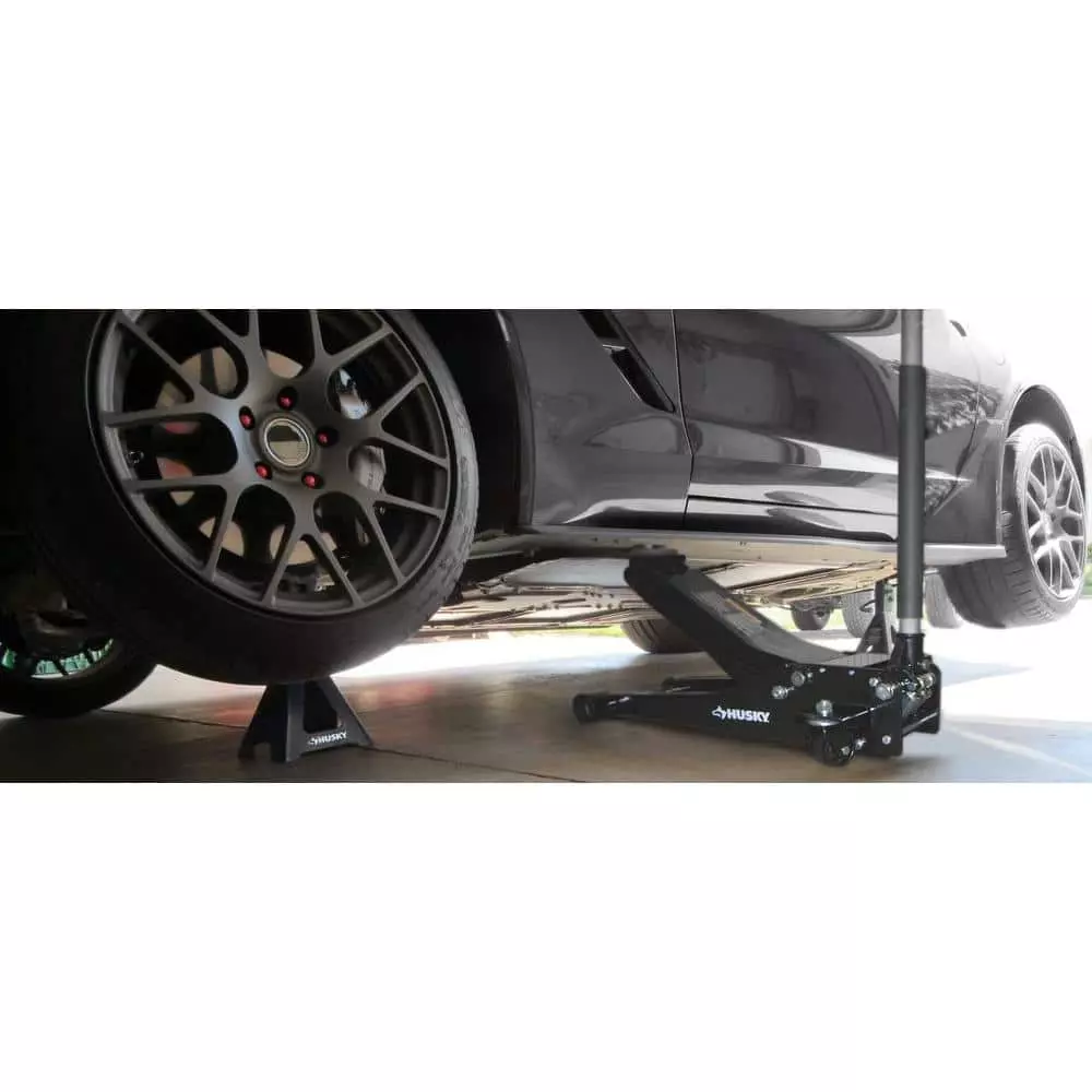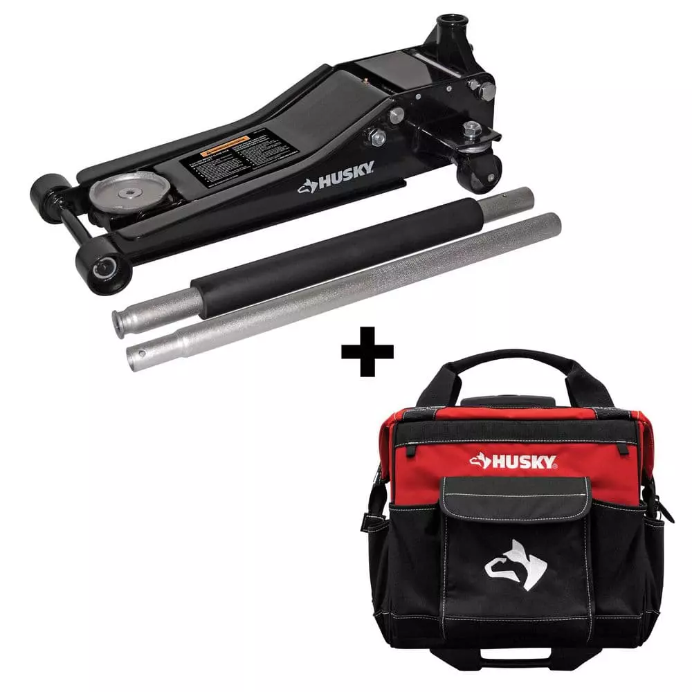 Husky 3-Ton Low Profile Floor Jack with Quick Lift with 14 in. 13 Pocket Rolling Tool Bag