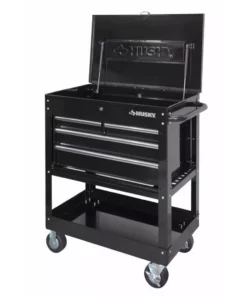 The Husky 33 in. 4-Drawer Mechanics Tool Cart is a heavy-duty utility cart that is essential in the shop, garage or even the office. The multi-sized drawers are equipped with 75 lbs. rated ball bearing slides to hold a variety of tools. The bottom storage tray is reinforced steel for your larger, heavier items and has approximately 14.5 in. of storage space height. The top storage area is a perfect place to keep your commonly used items easily within reach. In addition, the top storage area of the tool cart includes a locking lever to secure the 4-drawers and a keyed lock to secure the lid. The larger, push-bar handle and heavy-duty, 5 in. x 2 in. casters allow this cart to be easily moved around your work area. With no clumsy washers and nuts to deal with, this tool cart can be assembled in minutes with the included bolts and pre-mounted threads.