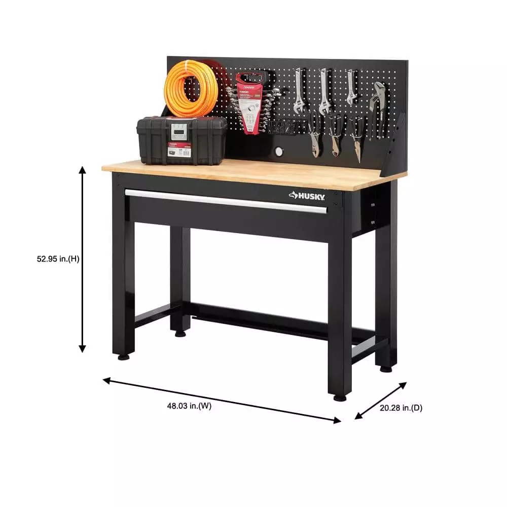 Extend your workspace with this Husky 4-ft. workbench. The solid wood top holds up to 1,500 lbs., and the heavy-duty steel legs provide stability. For versatility, it comes with a drawer, pegboard and holders. Included tools enable easy assembly. Perfect for garages, basements and workshops, it’s made to resist extreme temperatures and high humidity.