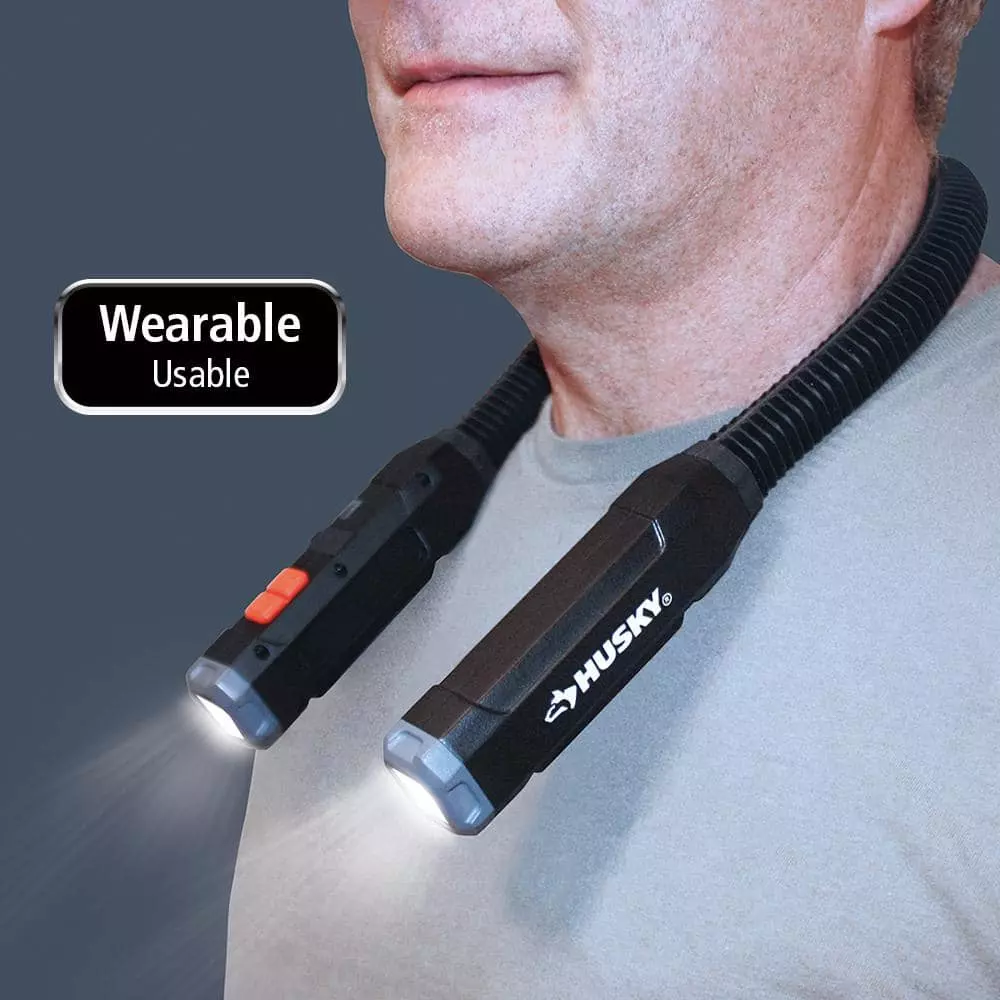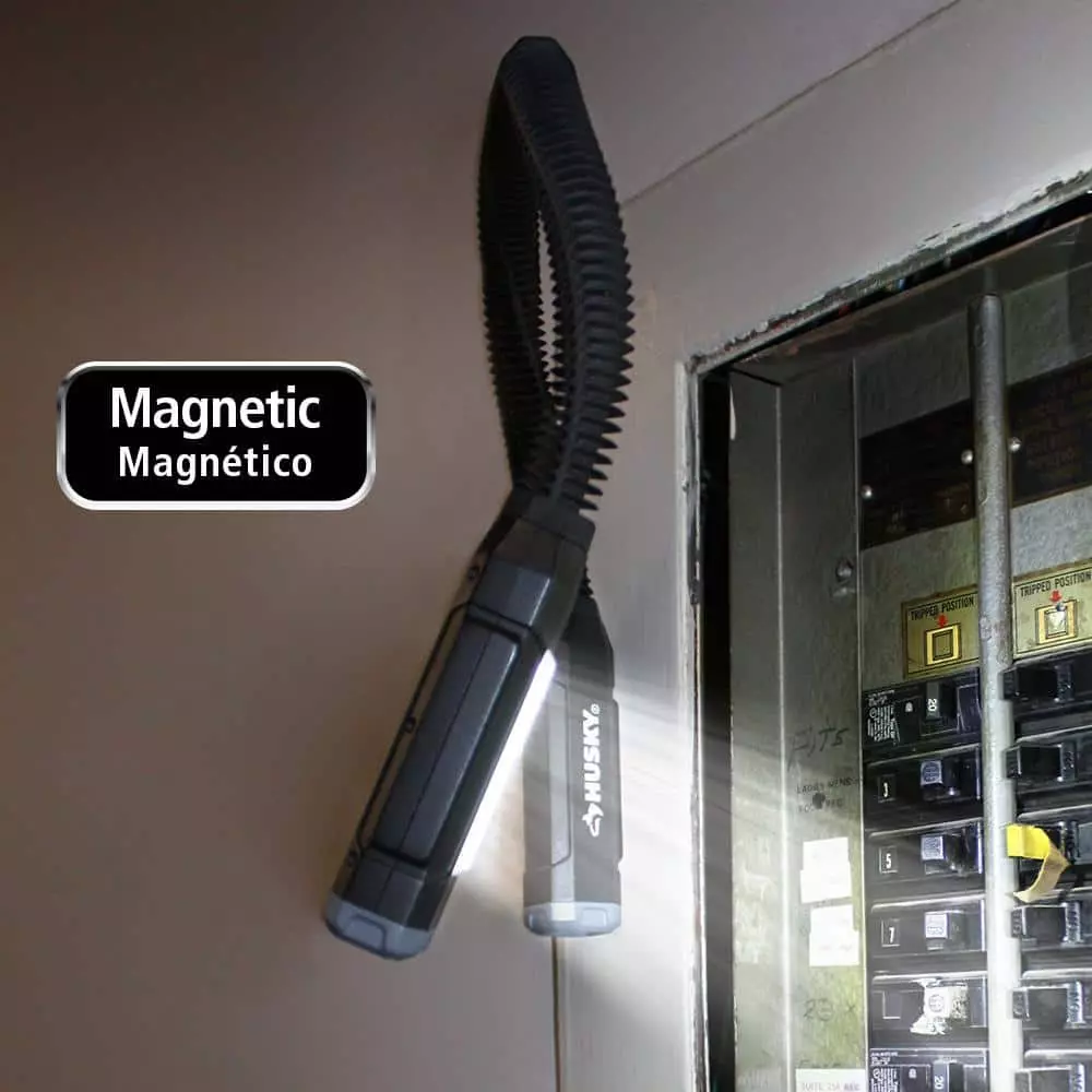 The Husky Flexible Work Light is a soft grip gill technology that allows you to wrap light tightly around objects leaving your hands free to work. Prop, coil and morph the light into any shape giving you the freedom to aim light in infinite directions. The Husky light has 3 modes for infinite uses. For 2 incredibly bright direct beams, articulate the front of the lights in any direction. For a dispersed flood light use the COB flood light. For extended battery life, dim the light to your desired setting. Simply press and hold the power switch to dim. With it’s soft and flexible design, this innovative light is comfortable enough to be worn around the body. Wrap it around your wrist or rest it on your neck for hands-free use. Included in the design is a heavy-duty magnet, giving you the versatility to magnetize it to any ferrous metal objects, including cars, the work ship, a toolbox or even the fridge. The Husky light is designed to operate in wet conditions, with an IPX4 water resistance rating. Made of high tensile silicone material, this light will hold up to the harshest conditions and is impervious to most automotive fluids.