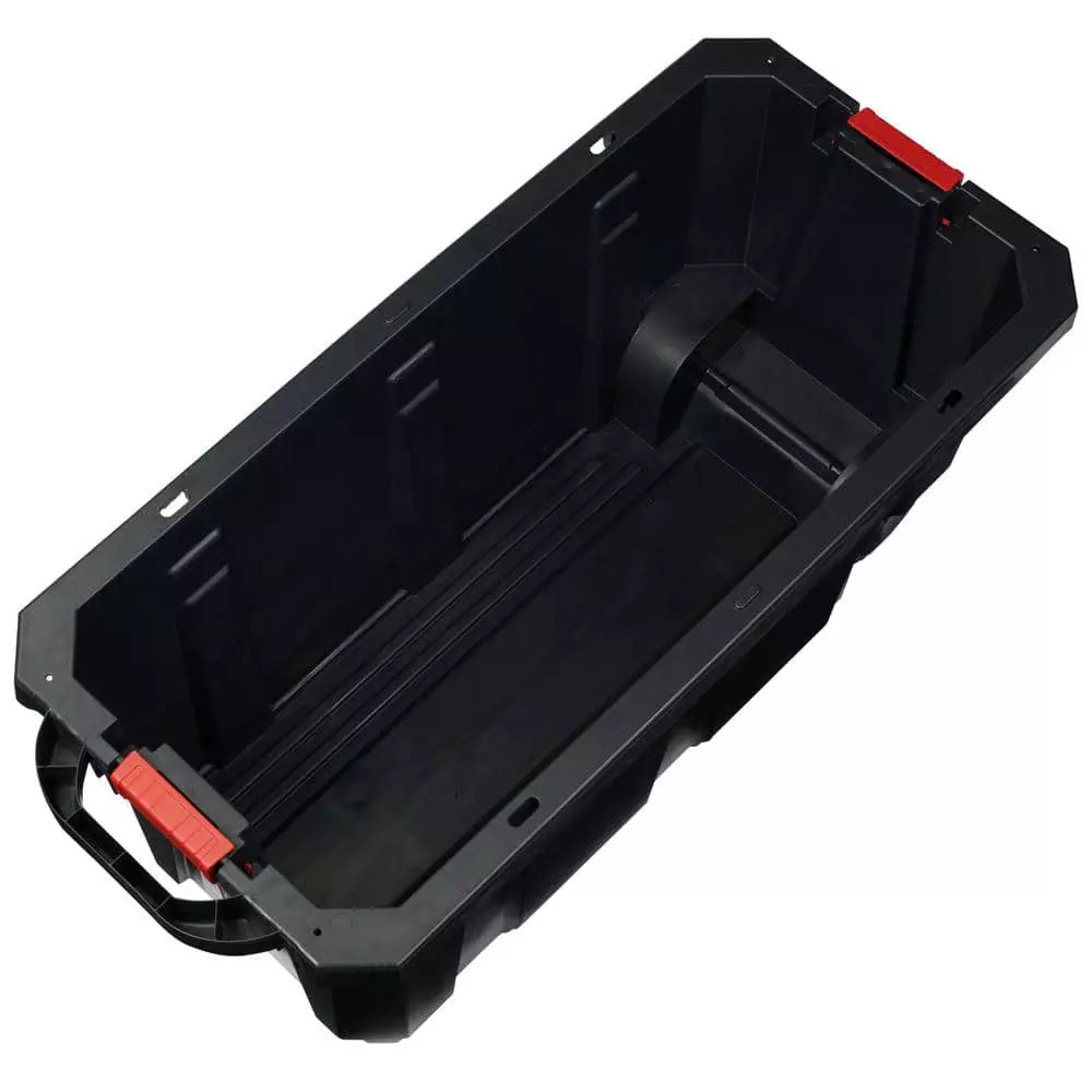 This Husky 45 Gal. heavy duty stackable storage tote is designed to handle all your storage needs whether it’s on the jobsite or around the house. The tote includes a black base made from durable recycled polypropylene and a red reinforced lid with red latches to secure and protect your valuables. This tote is a perfect option for the meticulous organizer who demands the very best in heavy-duty storage and protection. Integrated slots make the tote lockable to keep away unwanted intruders. This tote features innovative tie-down channels that allow it to be easily strapped down for simple transportation and fits most Hitch Mounted Cargo Carriers. Wheels added to make this the ultimate workers totes for easy transport.