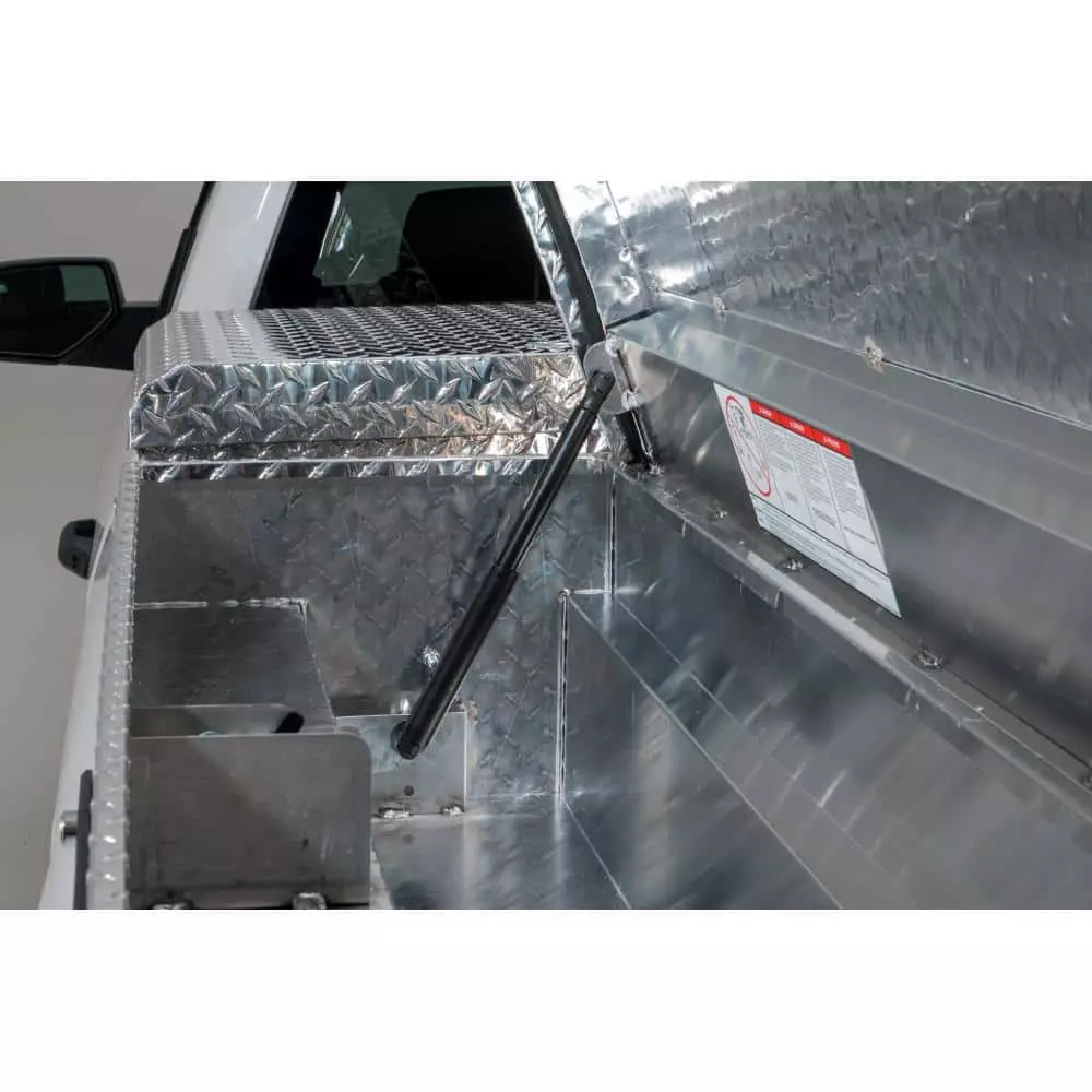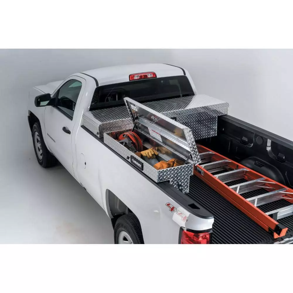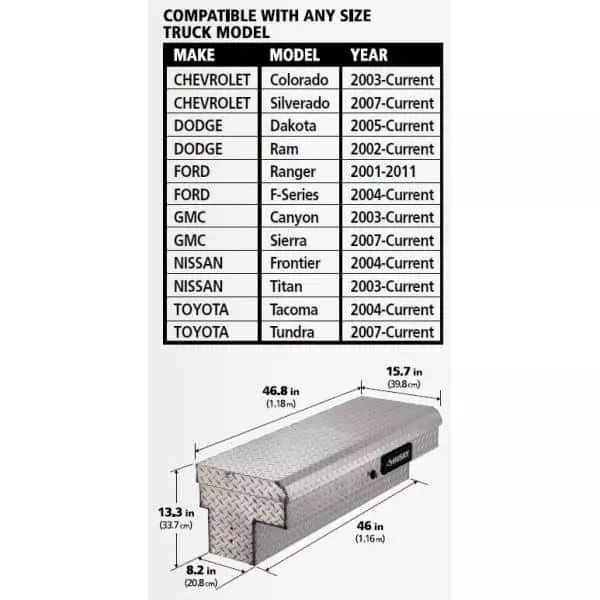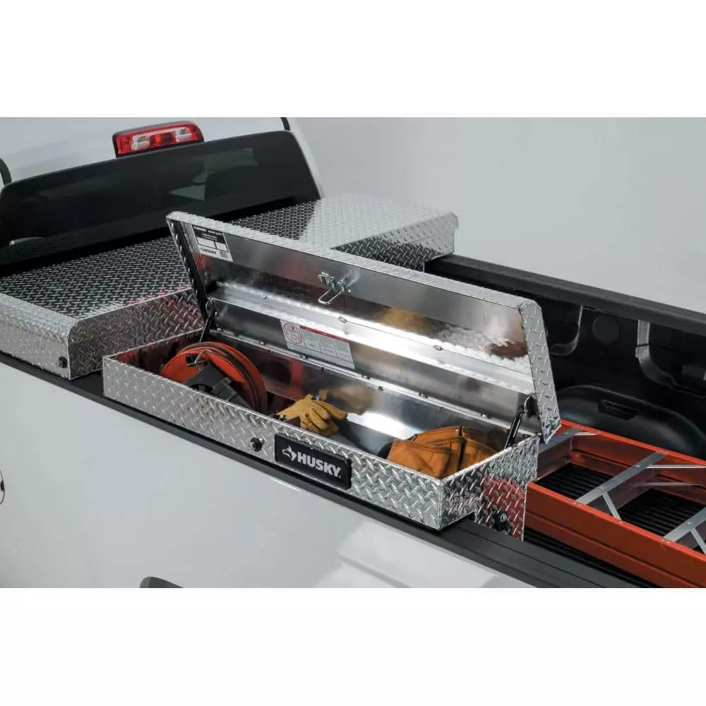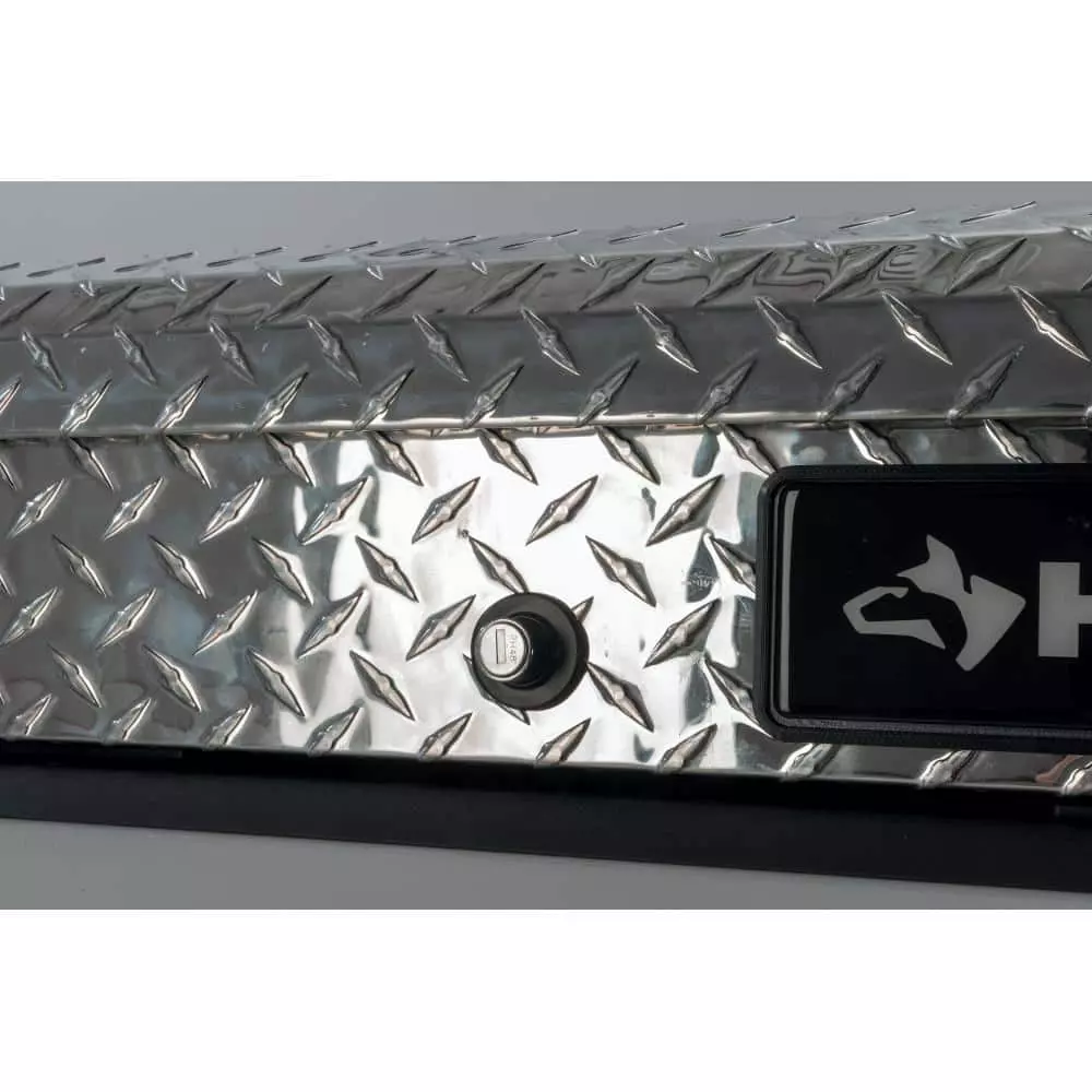 The Husky Aluminum Low Side Box for full size and compact trucks provides protection for your tools and equipment from the elements and break-ins. The low side box is the perfect companion for the Husky Aluminum Saddle Box when more protected storage is needed. The fully-welded aluminum construction and rubber weather seal protect your items from inclement weather. The easy-to-use, lockable push button and fully welded loop striker help resist break-ins. Included with the box is a sliding plastic tray that allows you to organize and easily access your small tools and hardware. Included as well is the mounting kit that mounts to the truck bed lip and floor.
