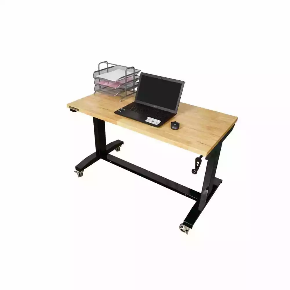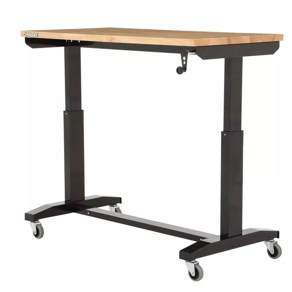 Elevate your work experience with the Husky 46 in. Adjustable-Height Work Table. This multi-functional work station features a manual crank that can raise and lower the work surface height. The 1.2 in. thick, solid wood top is rugged and beautiful and there is plenty of space on the 46 in. W x 24 in. D work surface. The workbench can be assembled with either the four, 3 in. x 2 in. polypropylene casters for mobility or attach the 4 leveling feet for use as a stationary table or desk. This work table has plenty of uses around the home, office, hobby room or garage. It is designed with a 300 lb. load capacity and an overhang so that you can easily attach your vise grips or cl-Amps while working on a project. This 46 in. Husky Work Table’s contemporary, adjustable-height feature allows you to have the flexibility to sit or stand while working. Research suggests that there are health benefits to alternating between standing and sitting throughout the day because it both decreases body discomfort and increases blood flow. The ergonomic design could also reduce eye and back strain and boost your productivity. The crossbar support can be installed in 2 different locations, depending on your preference. Install the support at the center of the table for an open, 2-sided work area. Or install it along the back of the legs to allow you the versatility of stowing your tool storage and rolling cabinets underneath to further organize your work space.