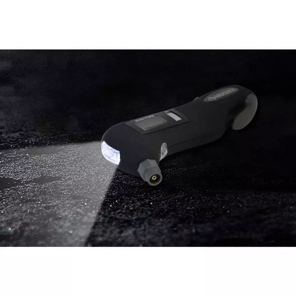 This 5-in-1 digital tire gauge is perfect for travel. 5 multi-functions include a digital tire gauge, LED flashlight, red LED light, retractable safety hammer and built-in seatbelt cutter. Compact size is easy to store and organize in your glove box. Metal nozzle core enhances durability and accuracy. Large, easy-to read LCD display with blue backlight. 4 pressure unit models are switchable. LED flashlight and red LED light for night use. Safety hammer and seatbelt cutter use in the event of an emergency. This tire gauge maintains proper tire pressure, reduce tire wear and extend tire life. Includes 1 AAA alkaline battery and 1 CR2032 coin li-ion battery.