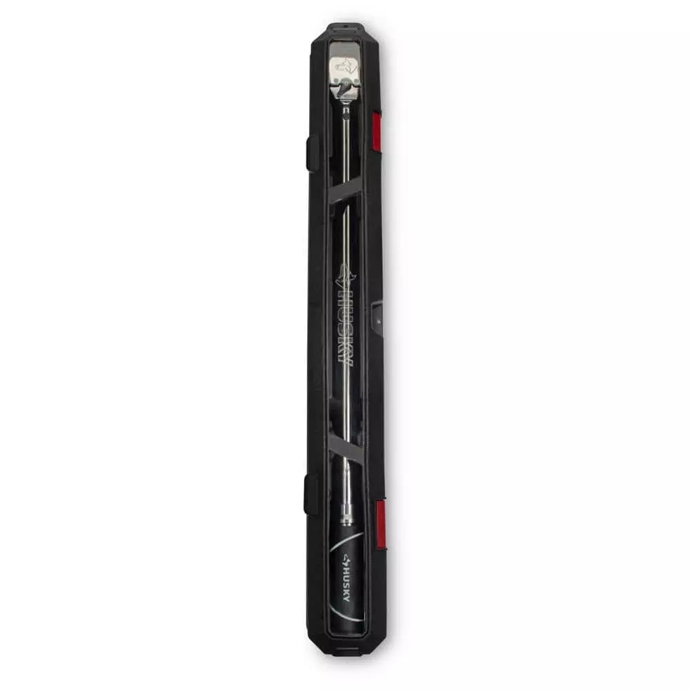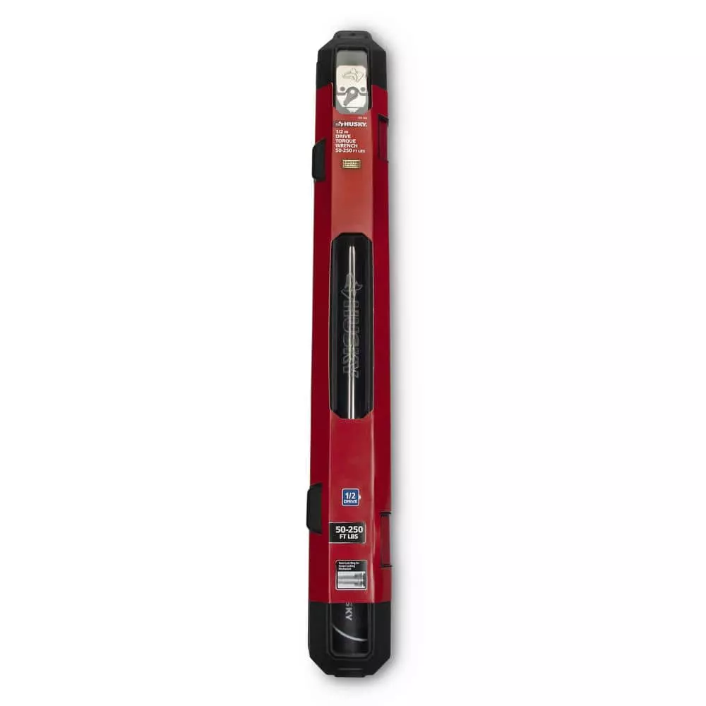 The Husky 1/2 in. Click Torque Wrench has a range of 50 ft./lbs. to 250 ft./lbs. and is made of alloy steel construction for strength and long-lasting performance. Its ergonomically designed handle easily turns to set torque. The finish provides resistance to corrosion and wipes clean easily. The Husky Torque wrench features a torque accuracy of plus/minus 3% CW in the upper 80% of wrench capability, and will give you an audible click when the desired torque setting is reached. Easy to use and effective in getting the job done accurately.