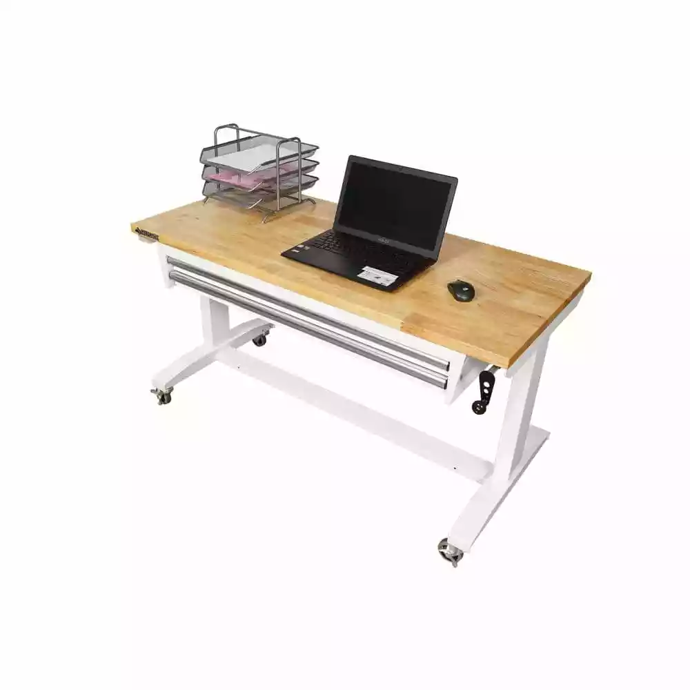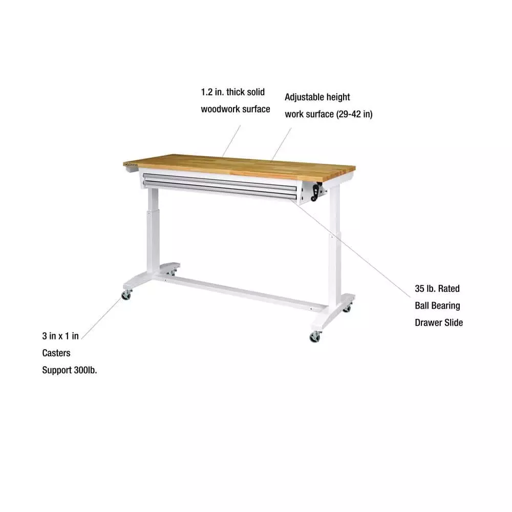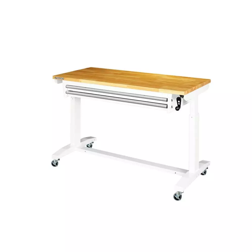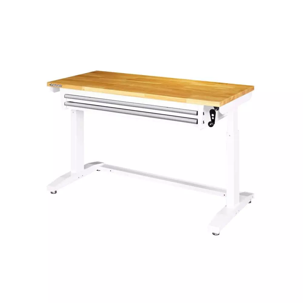 The Husky 52 in. Adjustable-Height Work Table with 2-Drawers is a multi-functional adjustable workbench with drawers work station that features a manual crank that can raise and lower the work surface. The 1.2 in. thick solid wood top offers plenty of space on the 52 in. W x 24 in. D work surface. The adjustable height work table with drawers can be assembled with either the four, 3 in. x 2 in. casters for mobility or attach the 4 leveling feet for use as a stationary table or desk. This Husky adjustable workbench with drawers has plenty of uses around the home, office, hobby room or garage. It is designed with a 300 lbs. weight capacity and an overhang so that you can easily attach your vise grips or clamps while working on a project. This 52 in. Husky adjustable height work table with drawers contemporary, adjustable-height feature allows you to have the flexibility to sit or stand while working. The ergonomic design could also reduce eye and back strain and boost your productivity. The crossbar support can be installed in 2 different locations, depending on your preference. Install the support at the center of the table for an open, 2-sided work area. Or install it along the back of the legs to allow you the versatility of stowing your tool storage and rolling cabinets underneath to further organize your work space.