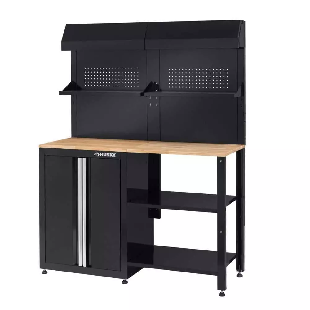 Safely store your important items with this 6-Piece Ready-to-Assemble Steel Garage Workstation in Black (53 in. W x 69.5 in. H x 19.5 in. D). It features two shelves, two trays, two wall cabinets and a welded base cabinet. You can easily assemble this garage workstation. The strong, powder-coated steel material makes this a durable option for your home.