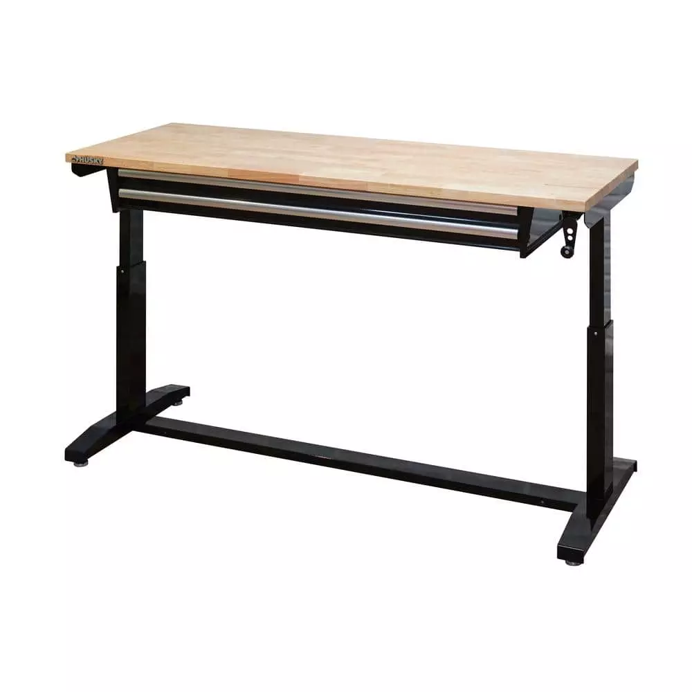 Elevate your work experience with the Husky 62 in. Adjustable-Height Work Table with 2 Drawers. This multi-functional work station features a manual crank that can raise and lower the work surface. The 1.2 in. T, solid wood top is rugged and beautiful and there is plenty of space on the 62 in. W x 24 in. D work surface. The workbench can be assembled with either the four 3 in. x 2 in. polypropylene casters for mobility or attach the 4 leveling feet for use as a stationary table or desk. This work table has plenty of uses around the home, office, hobby room or garage. It is designed with a 300 lbs. weight capacity and an overhang so that you can easily attach your vise grips or cl-Amps while working on a project. This 62 in. Husky Work Table’s contemporary, adjustable-height feature allows you to have the flexibility to sit or stand while working. Research suggests that there are health benefits to alternating between standing and sitting throughout the day because it both decreases body discomfort and increases blood flow. The ergonomic design could also reduce eye and back strain and boost your productivity. The crossbar support can be installed in 2 different locations, depending on your preference. Install the support at the center of the table for an open, 2-sided work area. Or install it along the back of the legs to allow you the versatility of stowing your tool storage and rolling cabinets underneath to further organize your work space.