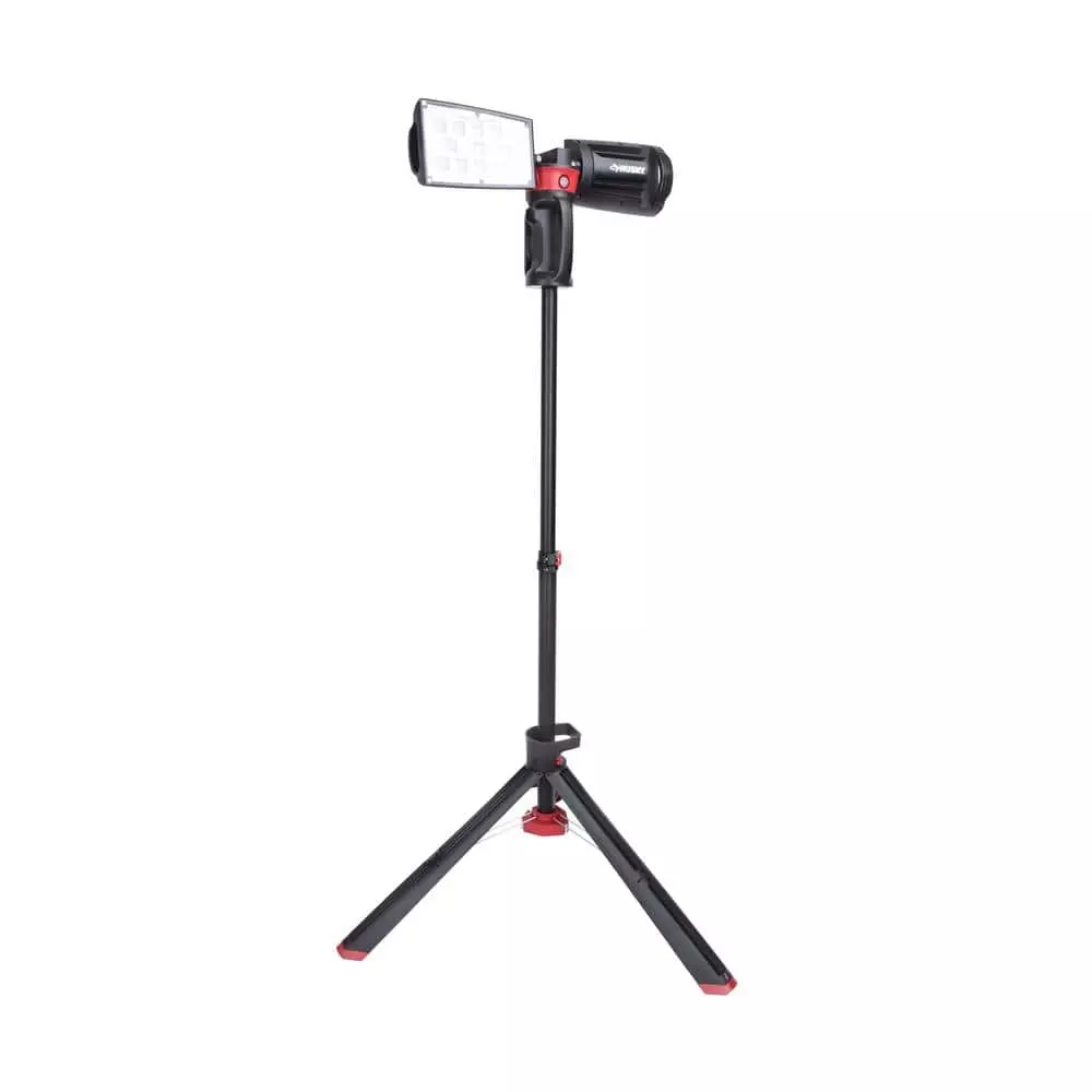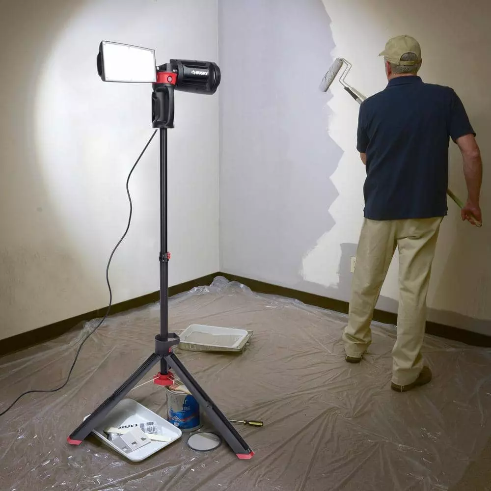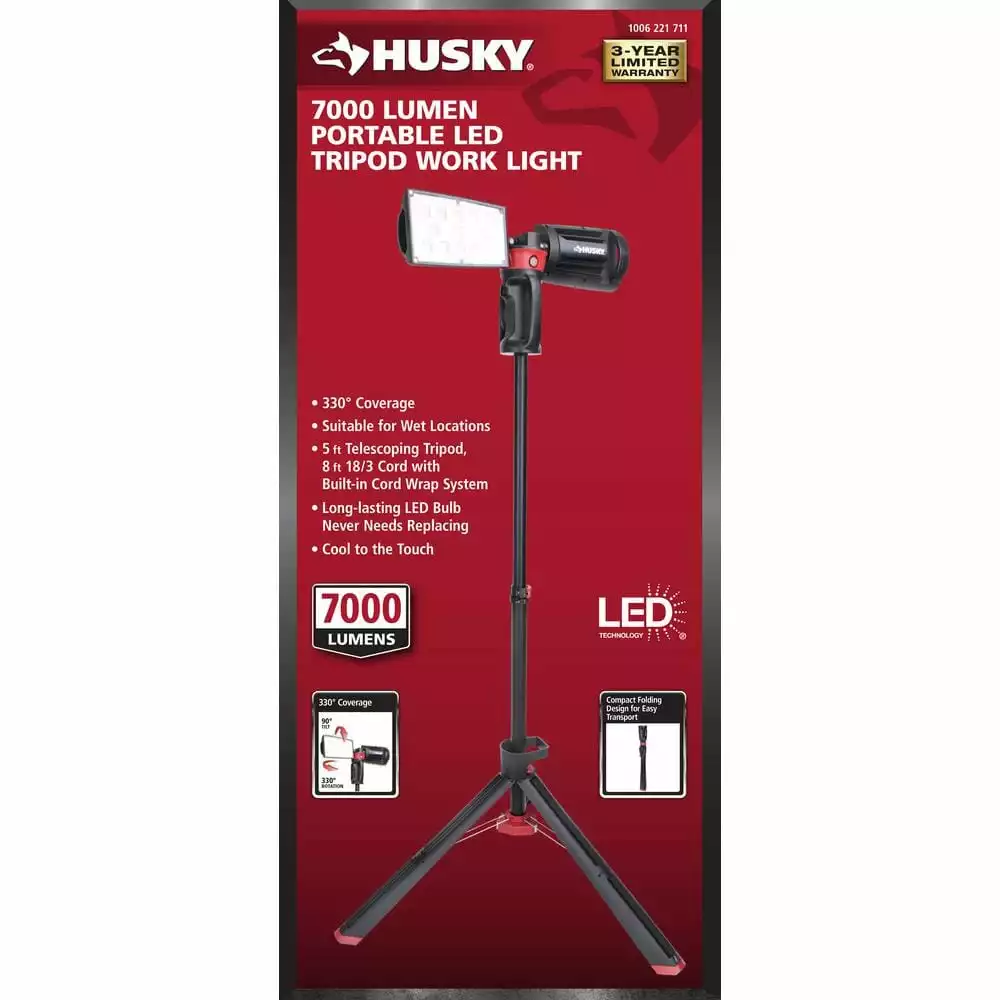 The Husky LED portable corded work light has the high output of 7000 Lumens. It is perfect for any home or job site project. With it’s heavy-duty professional grade die-cast aluminum housing, tri-pod stand and rotating heads it makes any job easier. When the job is finished, just fold up, wrap the cord up using the built-in cord wrap system and easily fold up.
