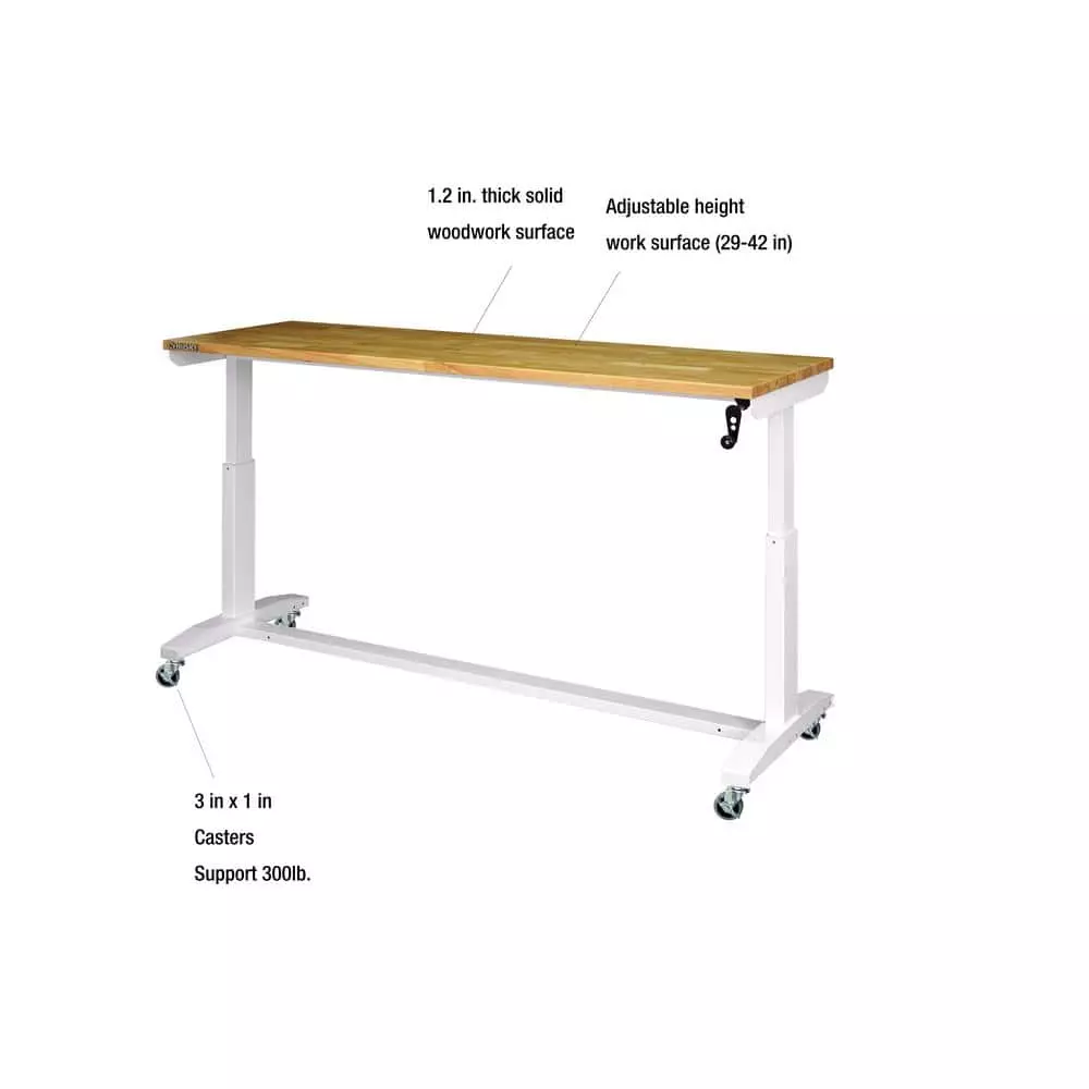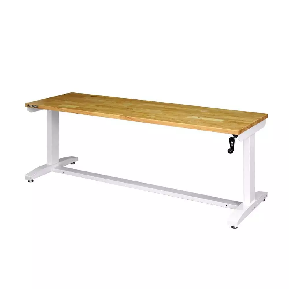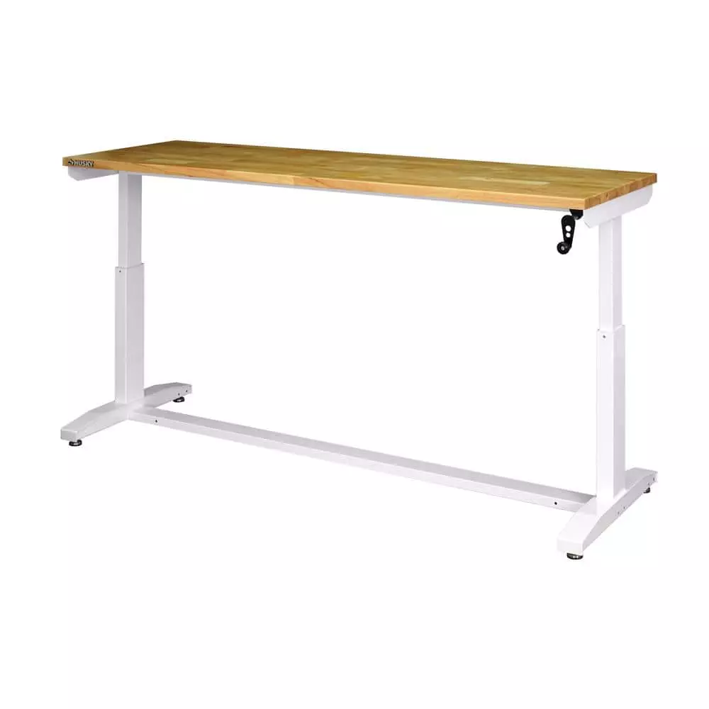 Elevate your work experience with the Husky 72 in. Adjustable-Height Work Table. This multi-functional work station features a manual crank that can raise and lower the work surface. The 1.2 in. thick, solid wood top is rugged and beautiful and there is plenty of space on the 72 in. W x 24 in. D work surface. The workbench can be assembled with either the four, 3 in. x 2 in. polypropylene casters for mobility or attach the 4 leveling feet for use as a stationary table or desk. This work table has plenty of uses around the home, office, hobby room or garage. It is designed with a 300 lbs. load capacity and an overhang so that you can easily attach your vise grips or cl-Amps while working on a project. This 72 in. Husky Work Table’s contemporary, adjustable-height feature allows you to have the flexibility to sit or stand while working. Research suggests that there are health benefits to alternating between standing and sitting throughout the day because it both decreases body discomfort and increases blood flow. The ergonomic design could also reduce eye and back strain and boost your productivity. The crossbar support can be installed in 2 different locations, depending on your preference. Install the support at the center of the table for an open, 2-sided work area. Or install it along the back of the legs to allow you the versatility of stowing your tool storage and rolling cabinets underneath to further organize your work space.