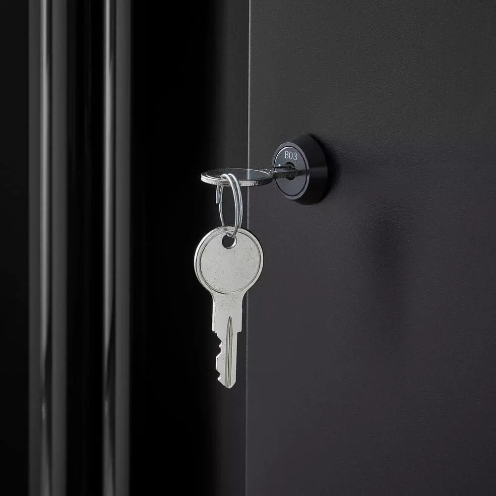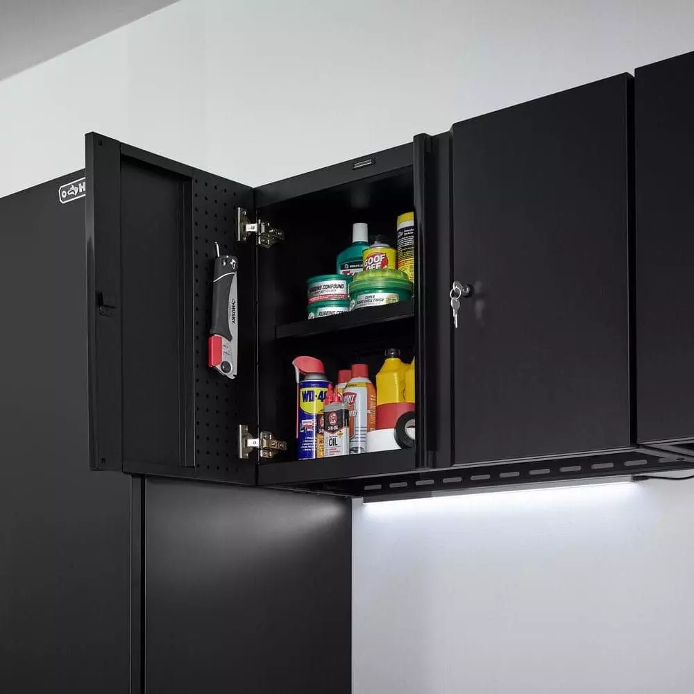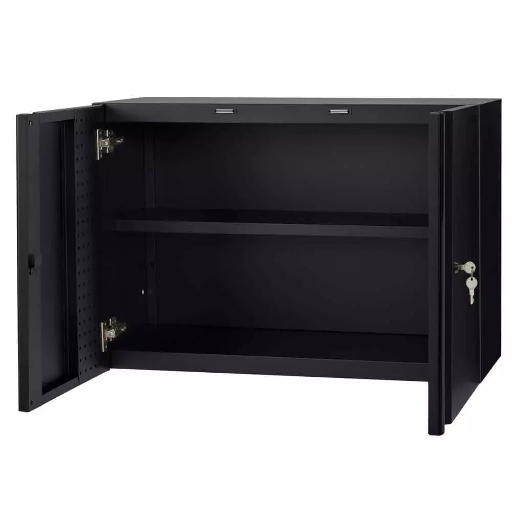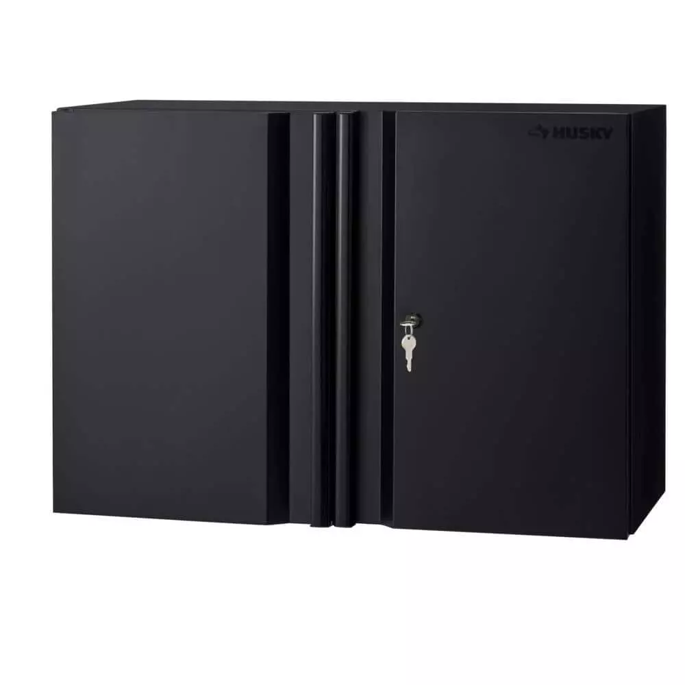 This wall mounted cabinet belongs to The Husky welded garage storage set, it is with well constructed with 20-Gauge steel, a shelf inside, with 3 point mechanic locking system which can secure your stuff. A hanging bracket with bullet-in level which can give perfect support during installation. Also it includes some utility access hole on bottom for some wires going through. Combine this cabinet with other pieces from the Husky heavy-duty Welded Cabinet Collection or other pieces from the Husky family of products for a garage storage solution that’s built to last.