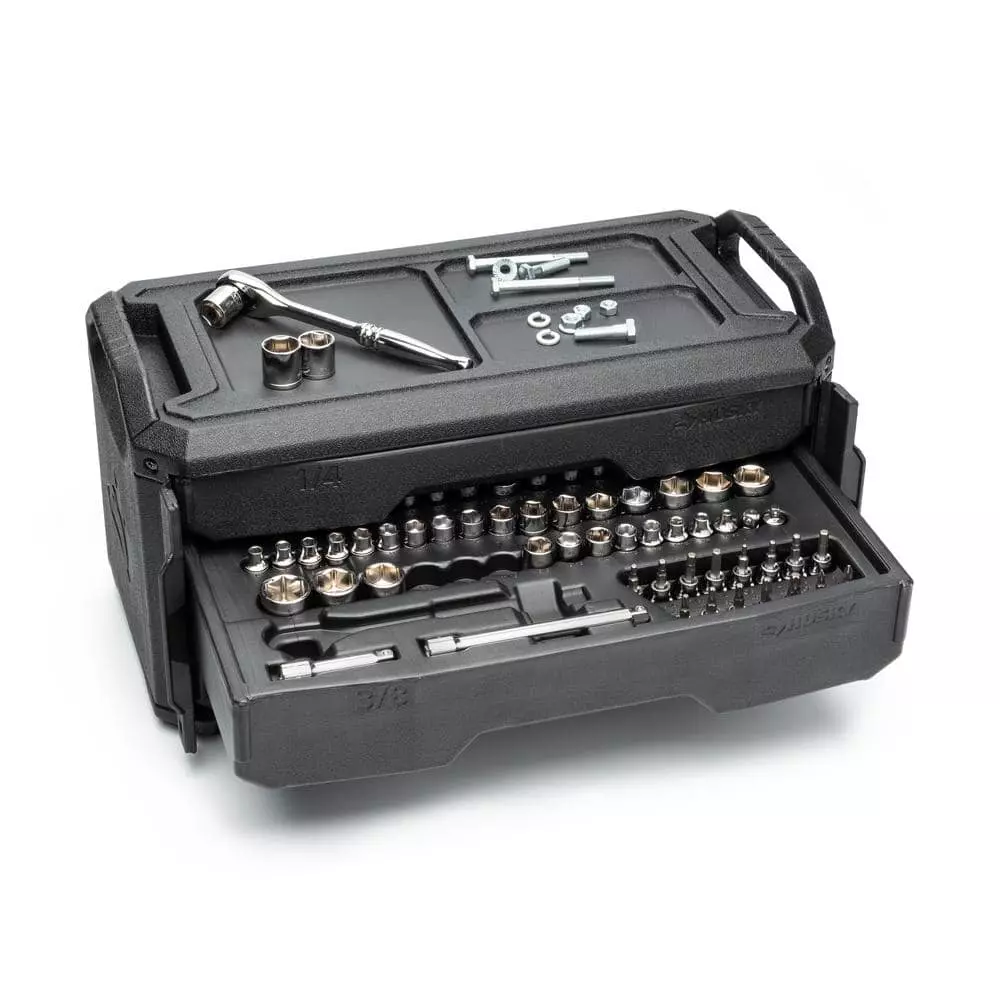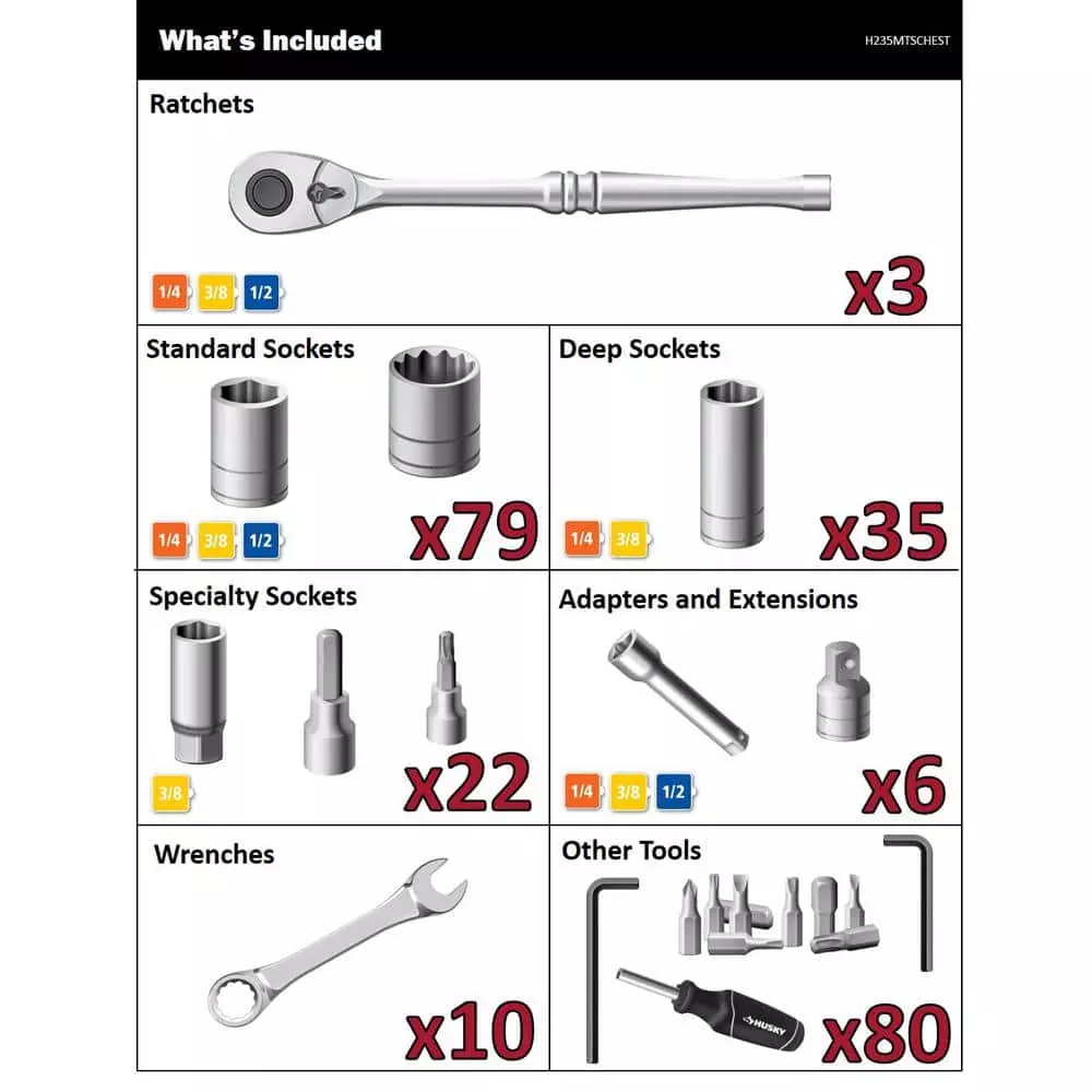 The Husky 235-piece tool set comes-packaged in a tool chest with 3 removable drive-size dedicated drawers for trouble-free transport. The chest holds the drawers securely with dual locking flaps, 1 on each side, and features a 3 compartment small parts tray on the top of the chest to help keep your project organized. This set contains SAE and Metric, standard and deep sockets, bit sockets, dive tools, wrenches, and accessories.