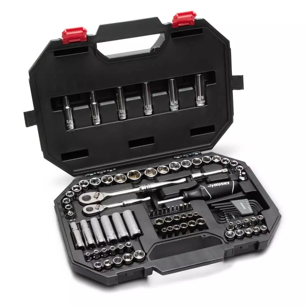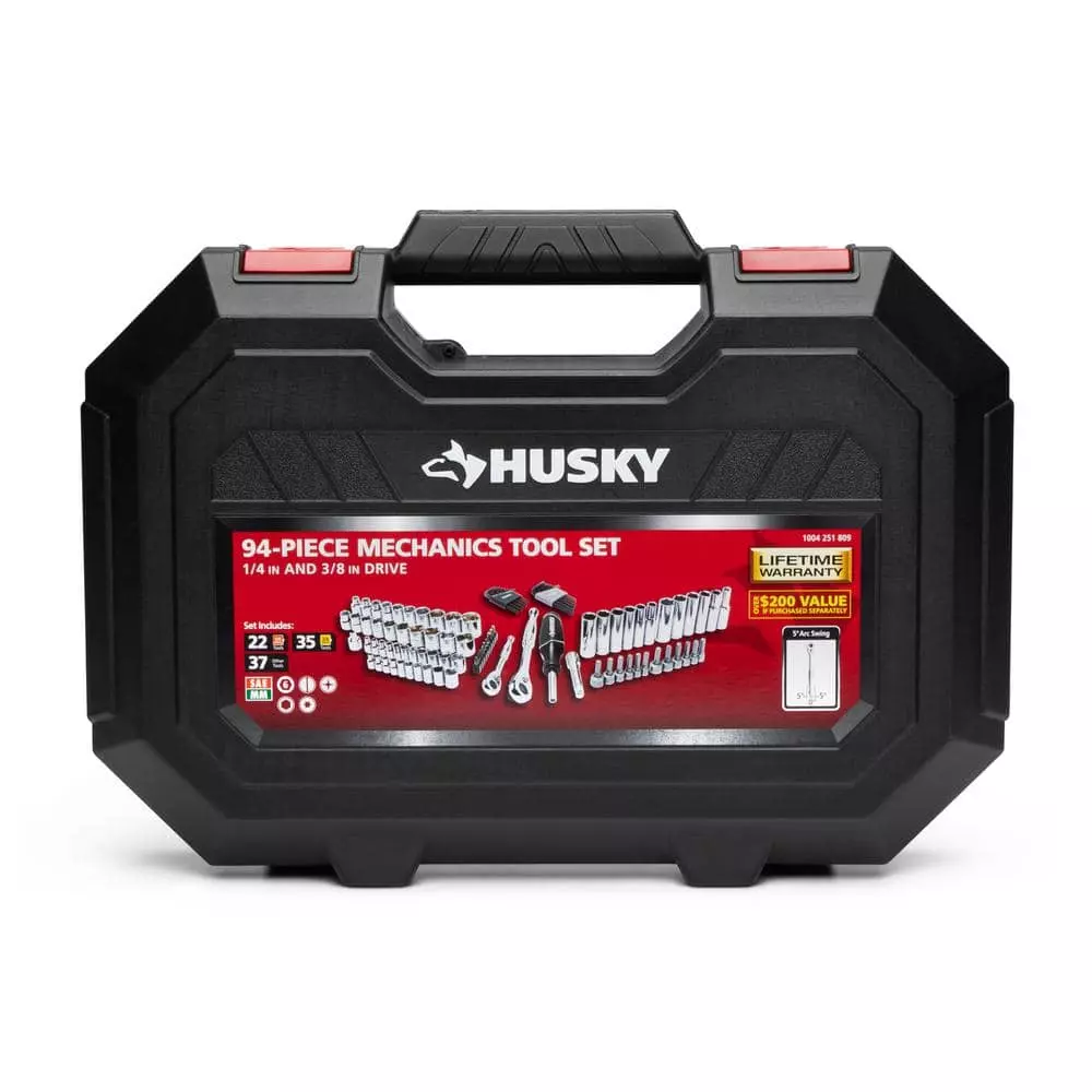 The Husky 94-Piece Mechanics Tool Set is a perfect set for the home DIYer or professional mechanic. The 53 different standard and deep sockets allow you to tackle a range of general fastening or repair projects. Sockets feature chamfered lead-ins to help provide a fast and easy placement onto drive tools and fasteners. Set also includes 37 accessories, 2 extensions, 2 ratchets and a storage case to keep it all organized. Compact and versatile for nearly any job, this mechanics tool set features an assortment of 1/4 in. and 3/8 in. drive sockets as well as accessory and drive tools for ultimate convenience. The 72 degree ratchets need only 5 degrees to turn a fastener, for hard to reach areas. For a complete product listing, see specification document.