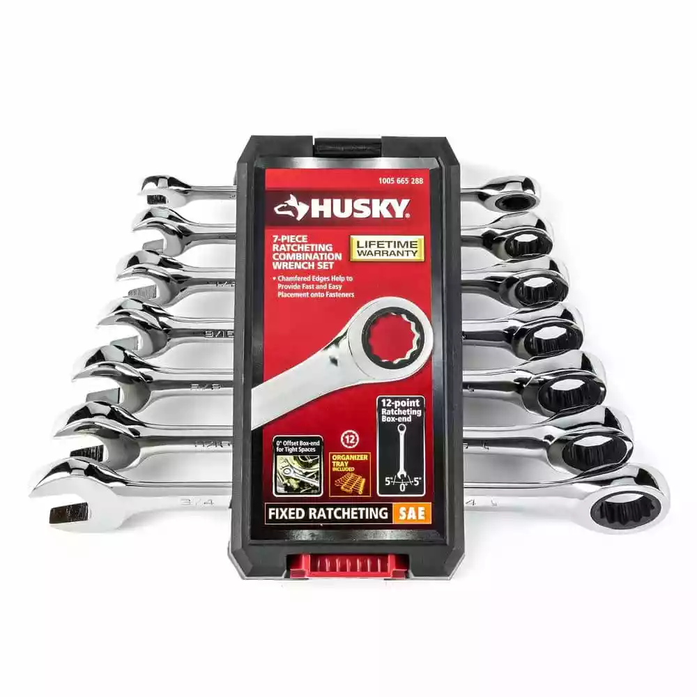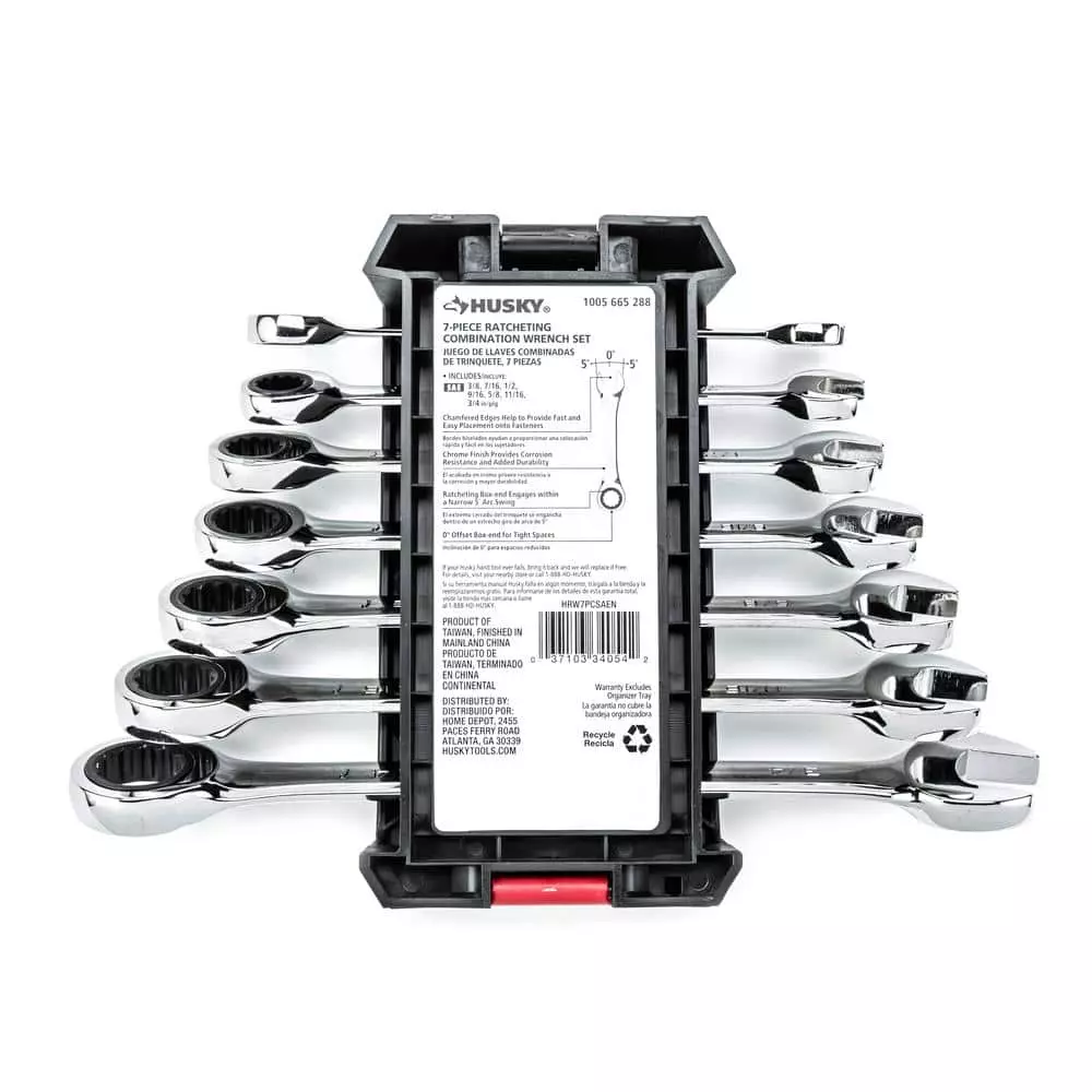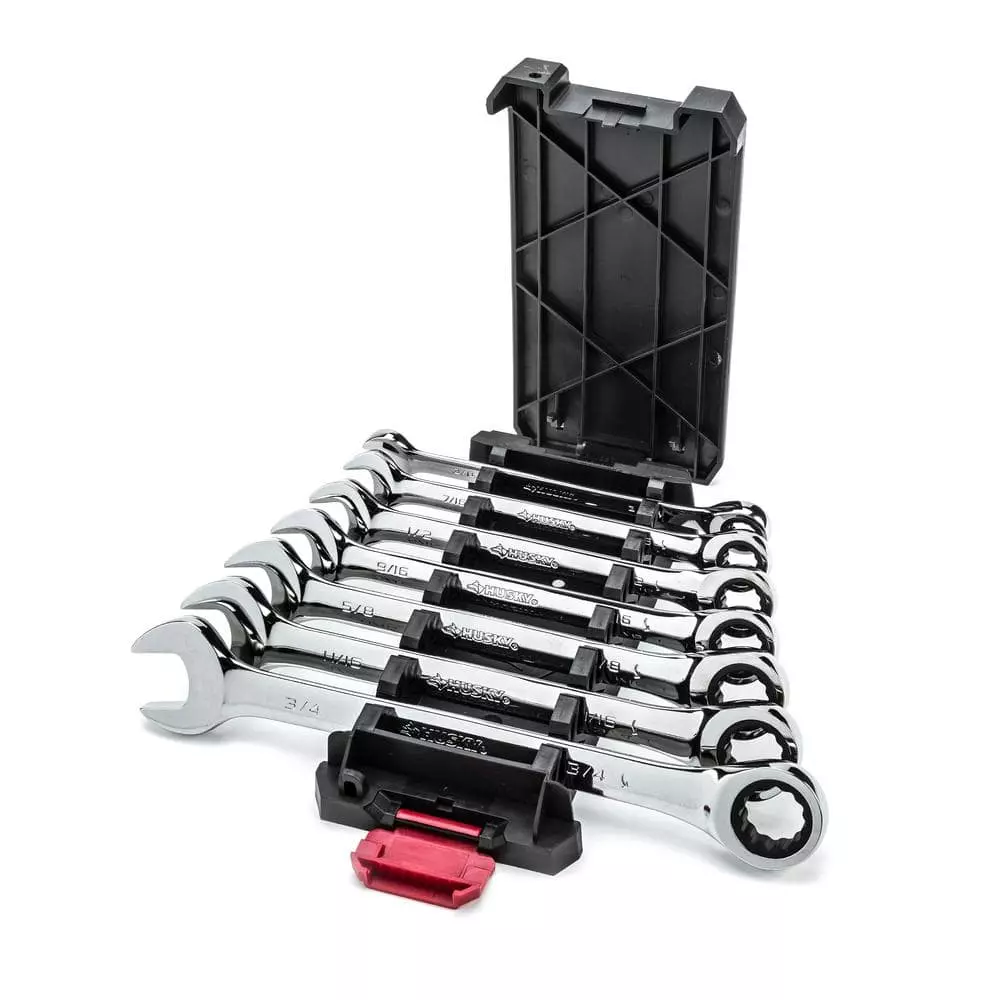 - Set includes 7 ratcheting wrenches covering sizes 3/8 in., 7/16 in., 1/2 in., 9/16 in., 5/8 in., 11/16 in., 3/4 in.