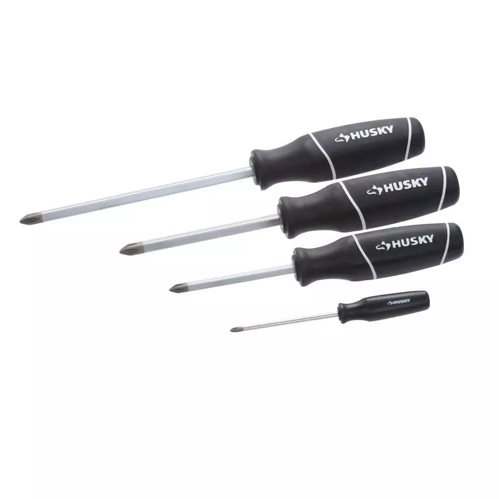 The Husky 10-Piece Screwdriver Set includes 6 slotted screwdrivers, 4 Philips screwdrivers for your fastening work. The handle shape is special pentagonal type to provide greater handle torque and more comfort, the tip size markings are injected for easy identification and longevity. Square steel blade provides added strength, chrome plated blade for corrosion resistance.