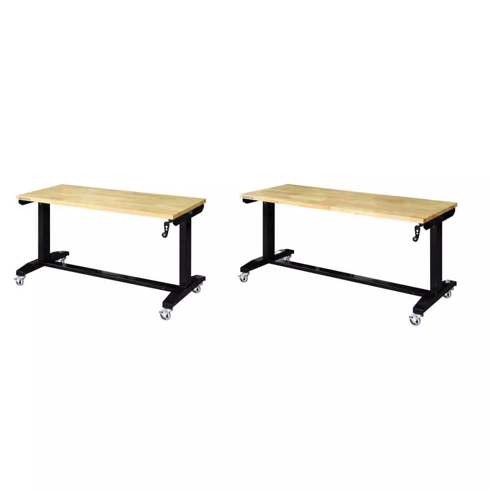 Elevate your work experience with this 52 in. and 62 in. Husky Adjustable-Height Work Tables. This multi-functional work station features a manual crank that can raise and lower the work surface. The 1.2 in. thick, solid wood top is rugged and beautiful and there is plenty of space on the 62 in. W x 24 in. D work surface. The workbench can be assembled with either the four, 3 in. x 2 in. polypropylene casters for mobility or attach the 4 leveling feet for use as a stationary table or desk. This work table has plenty of uses around the home, office, hobby room or garage. It is designed with a 300 lb. load capacity and an overhang so that you can easily attach your vise grips or cl-Amps while working on a project. This 62 in. Husky Work Table’s contemporary, adjustable-height feature allows you to have the flexibility to sit or stand while working. Research suggests that there are health benefits to alternating between standing and sitting throughout the day because it both decreases body discomfort and increases blood flow. The ergonomic design could also reduce eye and back strain and boost your productivity. The crossbar support can be installed in 2 different locations, depending on your preference. Install the support at the center of the table for an open, 2-sided work area. Or install it along the back of the legs to allow you the versatility of stowing your tool storage and rolling cabinets underneath to further organize your work space.